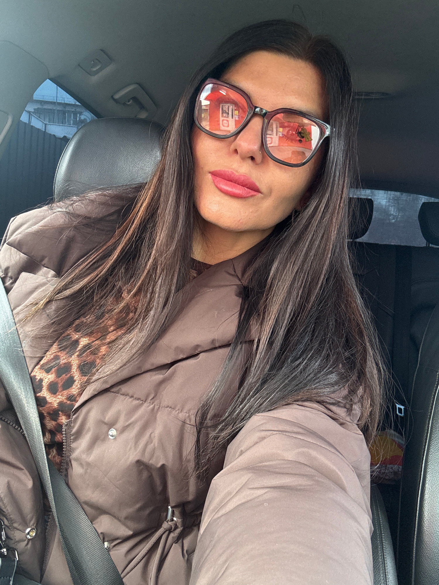 A woman wearing glasses and a brown jacket with a leopard print collar is sitting in a car, fastened with a seatbelt. The glasses reflect buildings and signage in the city of Chaikovsky, Russia.