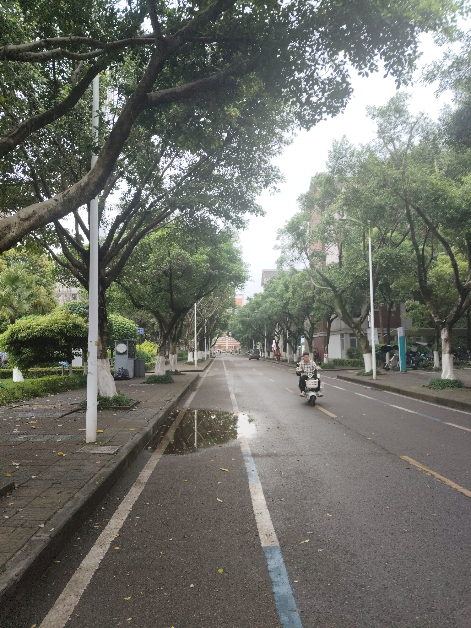 A street scene in Chongqing High-tech Zone, China. A person on a white scooter travels down the center of the asphalt road. Trees line both sides of the street. Lamp posts with white painted bases are…read more