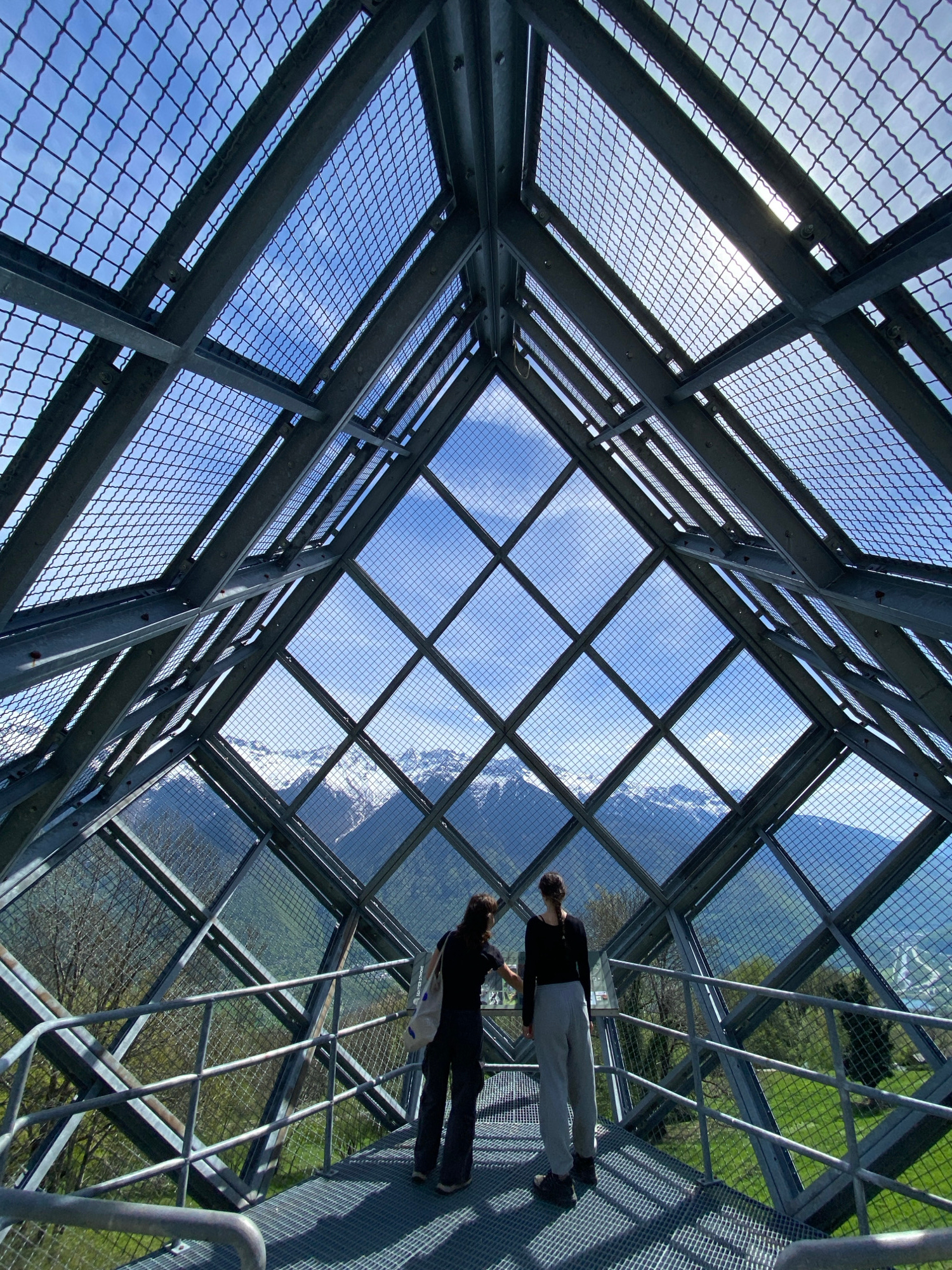 This low-angle photograph captures the interior of a modern observation structure, likely a skywalk or viewing platform, situated in Saint-Georges-d'Hurtières, France. The scene is dominated by a robu…read more