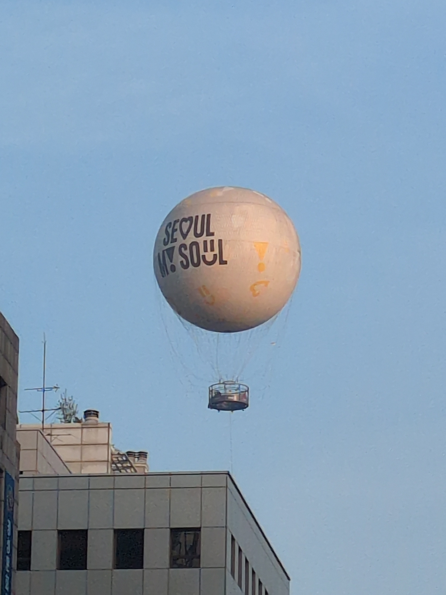 The image shows a large, tethered helium balloon floating above buildings in Seoul, South Korea. The balloon is light-colored with the words "SEOUL MY SOUL" written vertically in black. It also has ye…read more