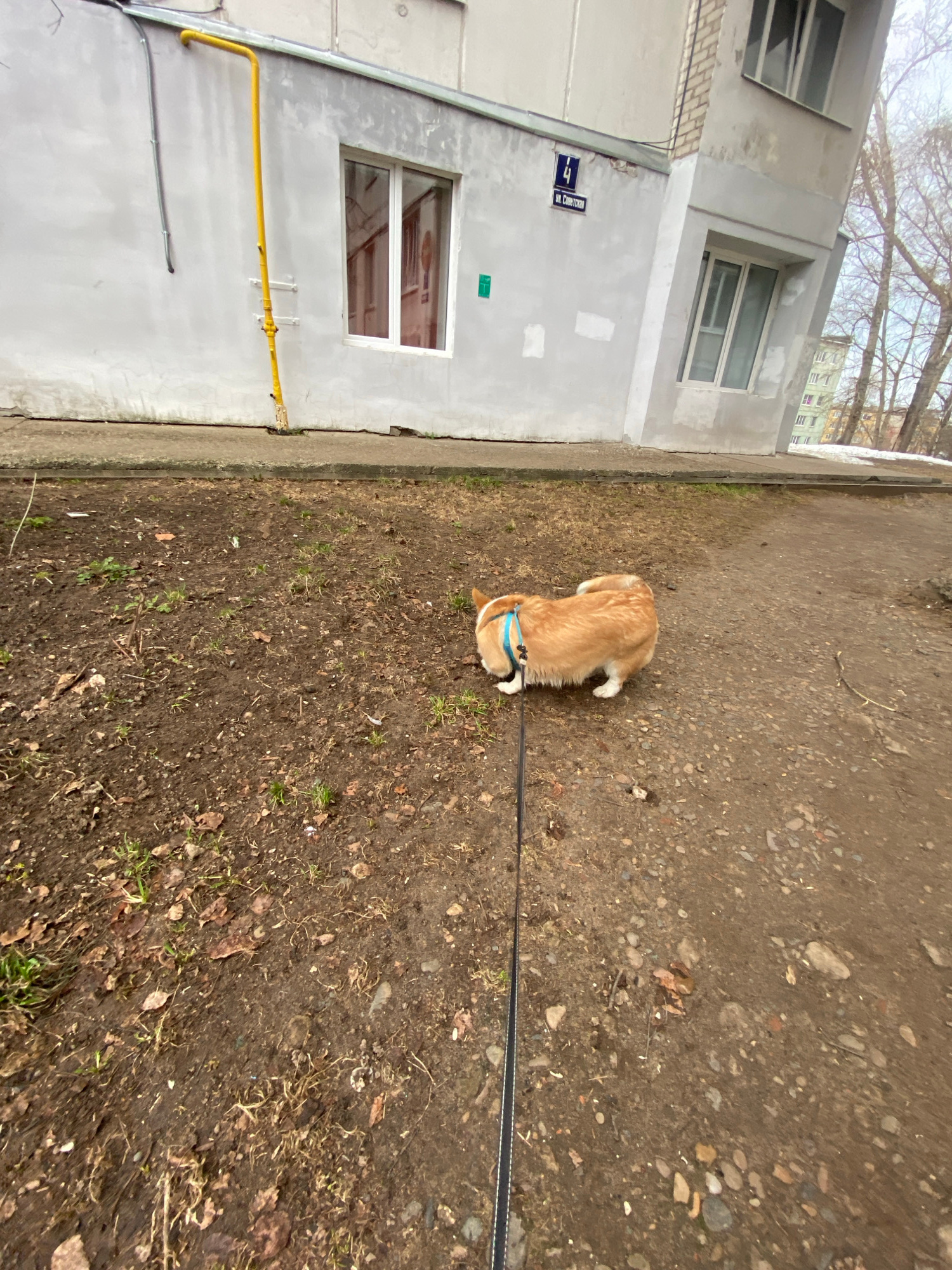 The image shows a corgi dog on a leash in a yard next to a building. The building, located at 4 Tchaikovsky Street, in the city of Chaikovsky, Russia, is grey with several windows and yellow gas pipes…read more