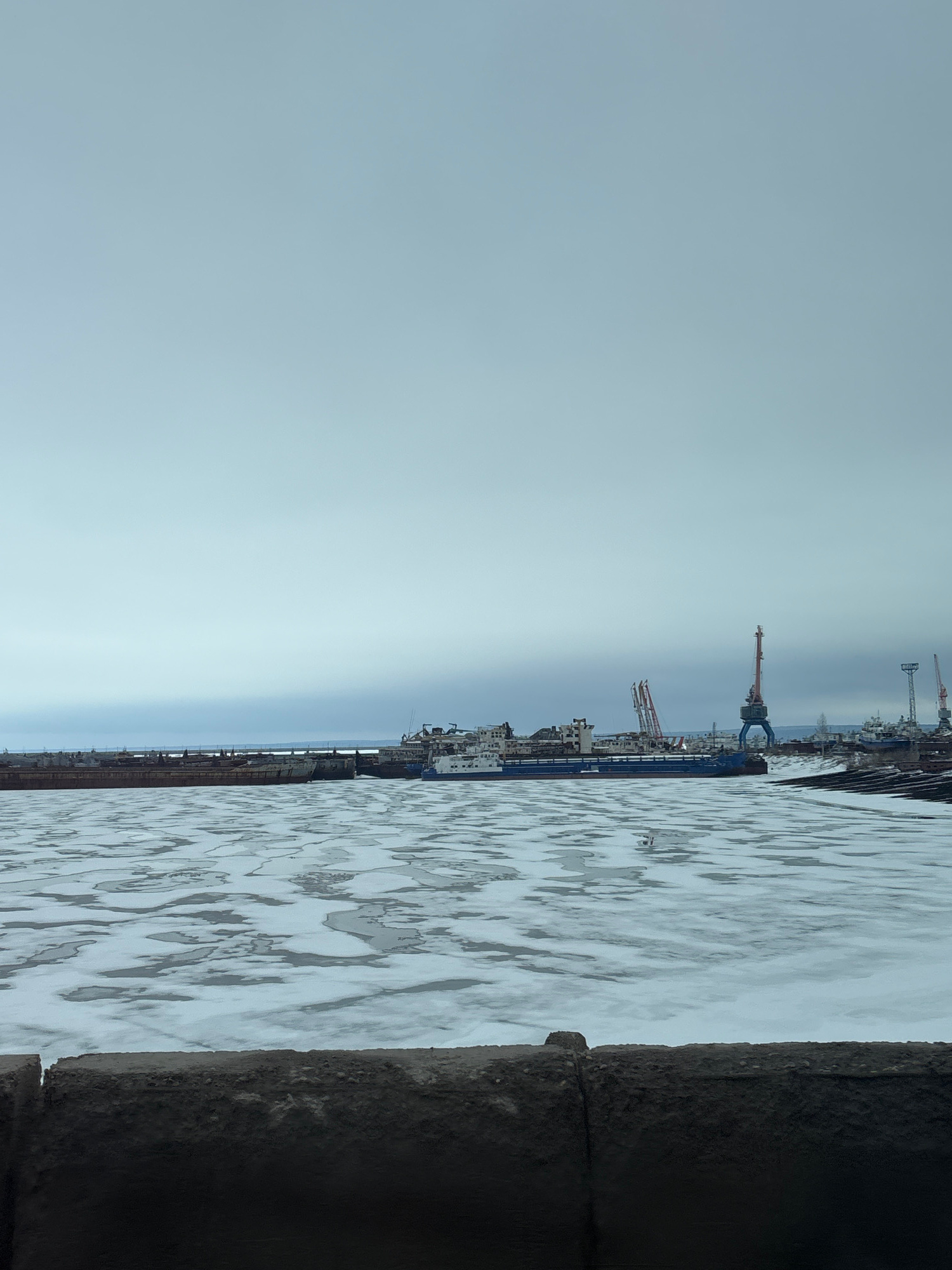 The image shows a view of the Kama River waterfront in Chaikovsky, Russia. Ice floes cover the water surface, and along the shore, a concrete embankment is visible. In the background, a harbor with ca…read more