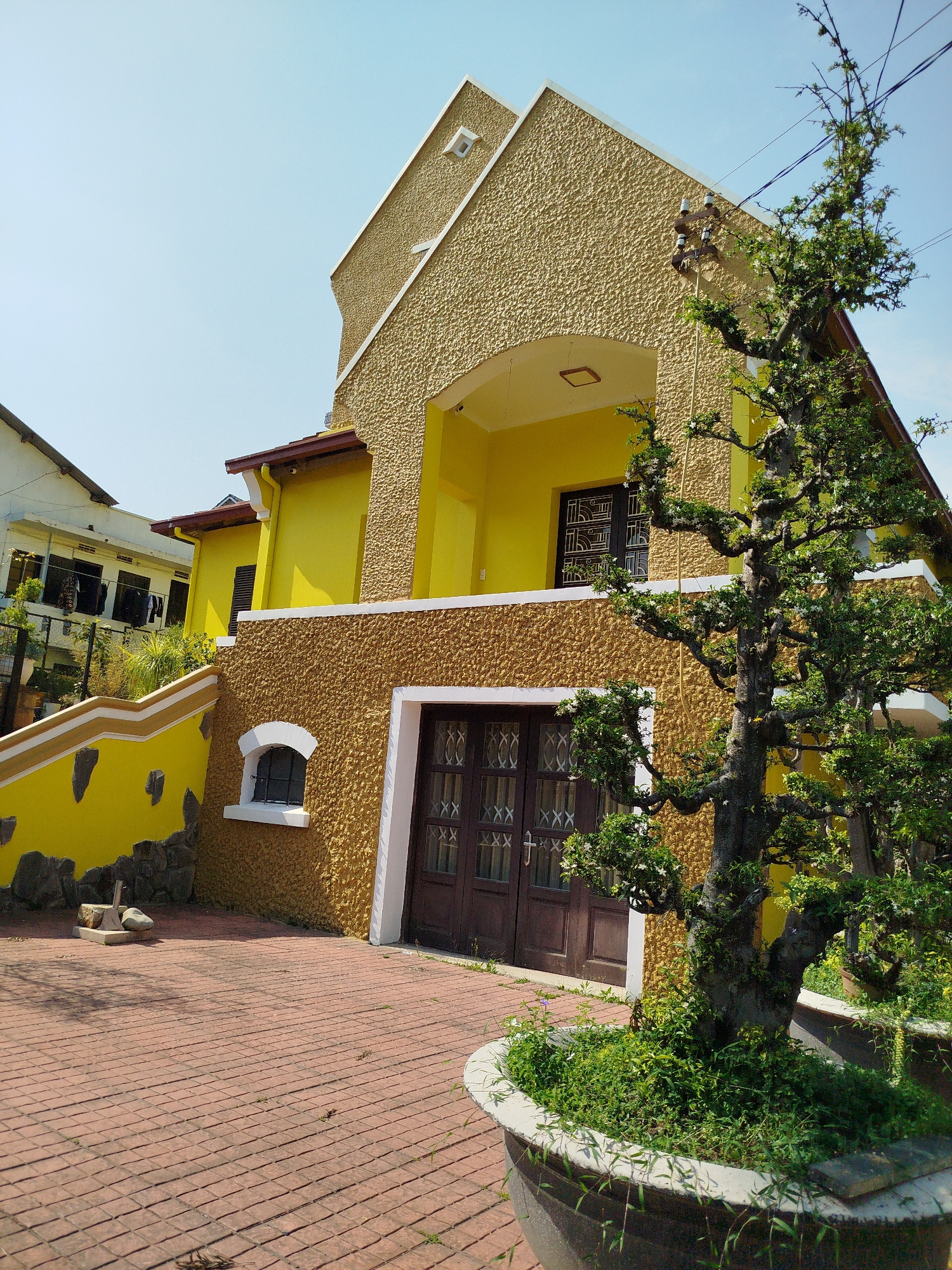 The image shows a two-story building with a yellow exterior in an area of Unknown, Vietnam. The building is textured with what appears to be pebble-dash rendering. The front of the building is a mixtu…read more