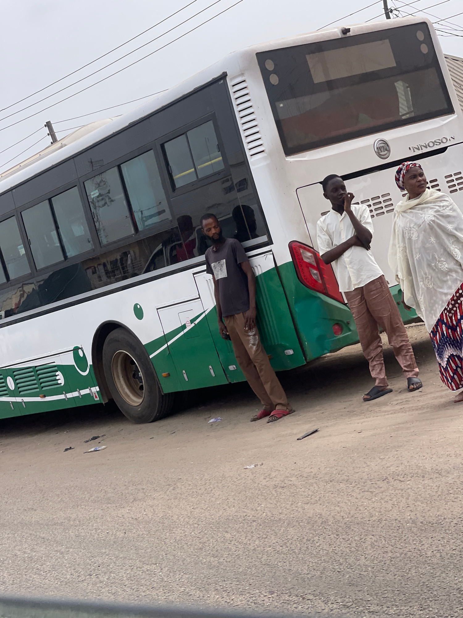 A daytime street scene in Ado, Nigeria, features a white and green double-decker passenger bus and several individuals standing nearby. The bus, bearing the brand "INNOSONNI" and a corresponding logo…read more