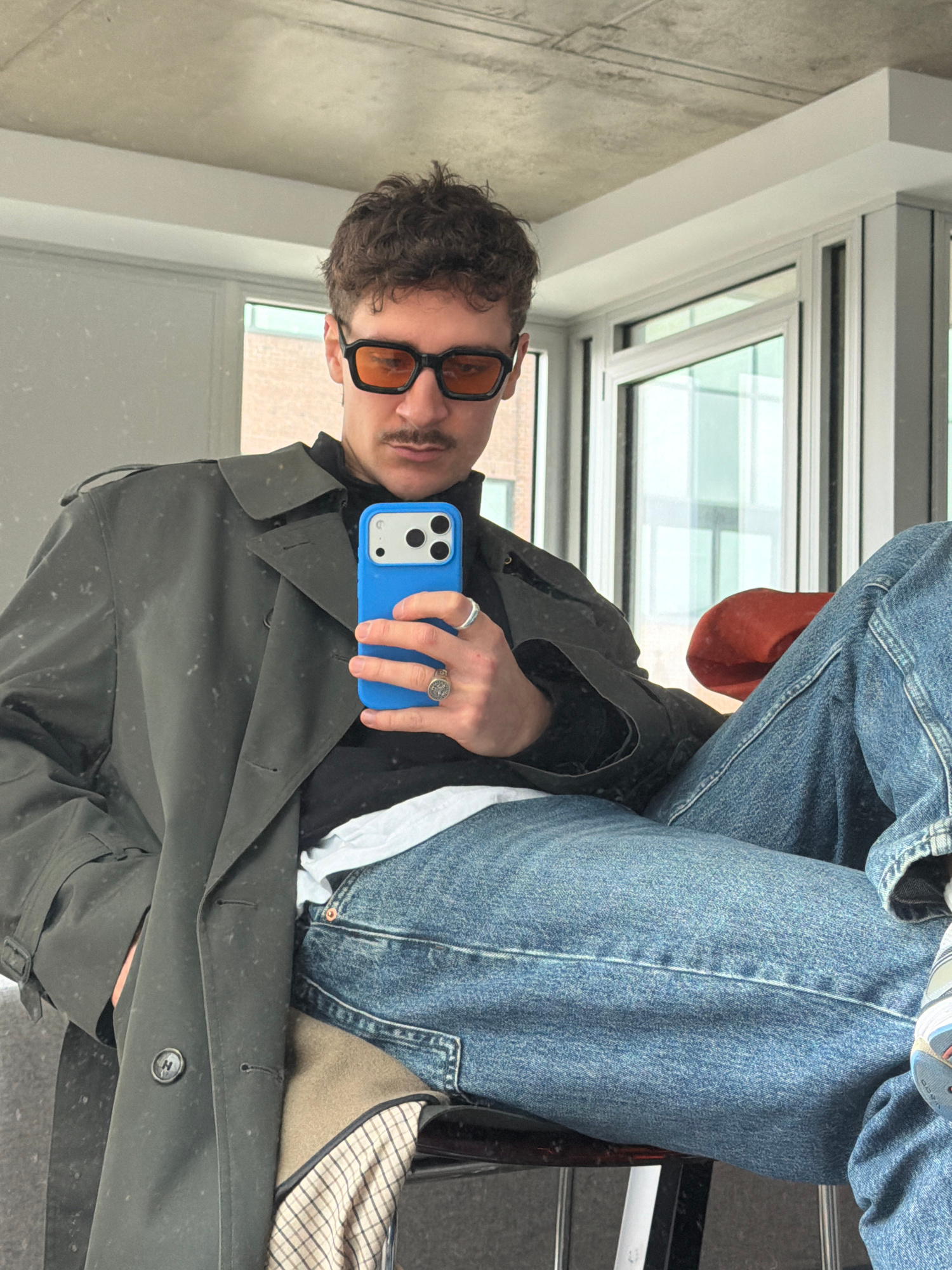 The image shows a man with curly dark hair, a mustache, and amber-tinted sunglasses taking a selfie in front of a mirror. He is wearing a dark trench coat over a black shirt with a glimpse of a white…read more