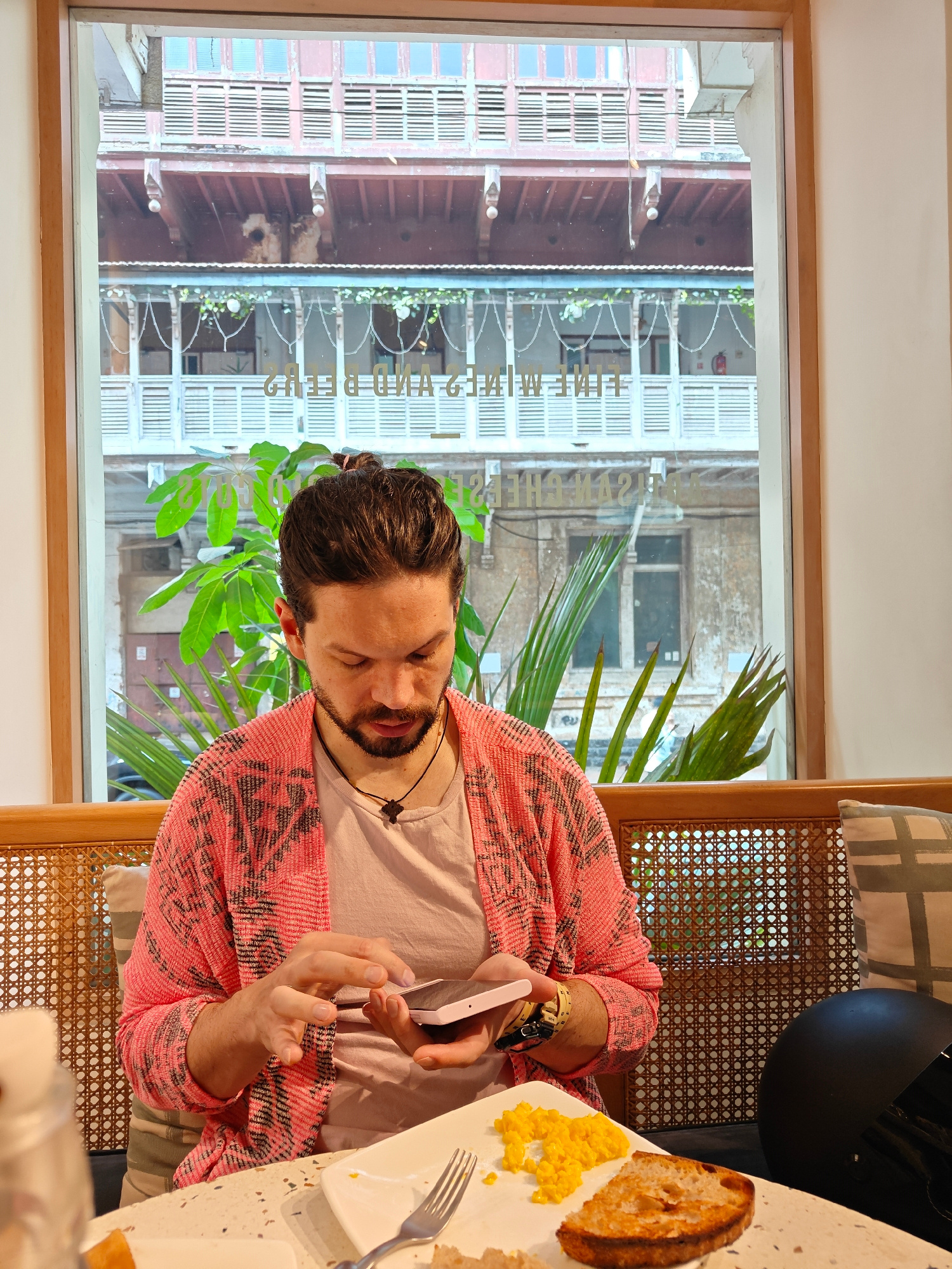 A man with a beard and dark hair pulled back in a bun is sitting at a table in a cafe, looking at his smartphone. He wears a light pink t-shirt and a pink cardigan with a geometric pattern. A necklace…read more