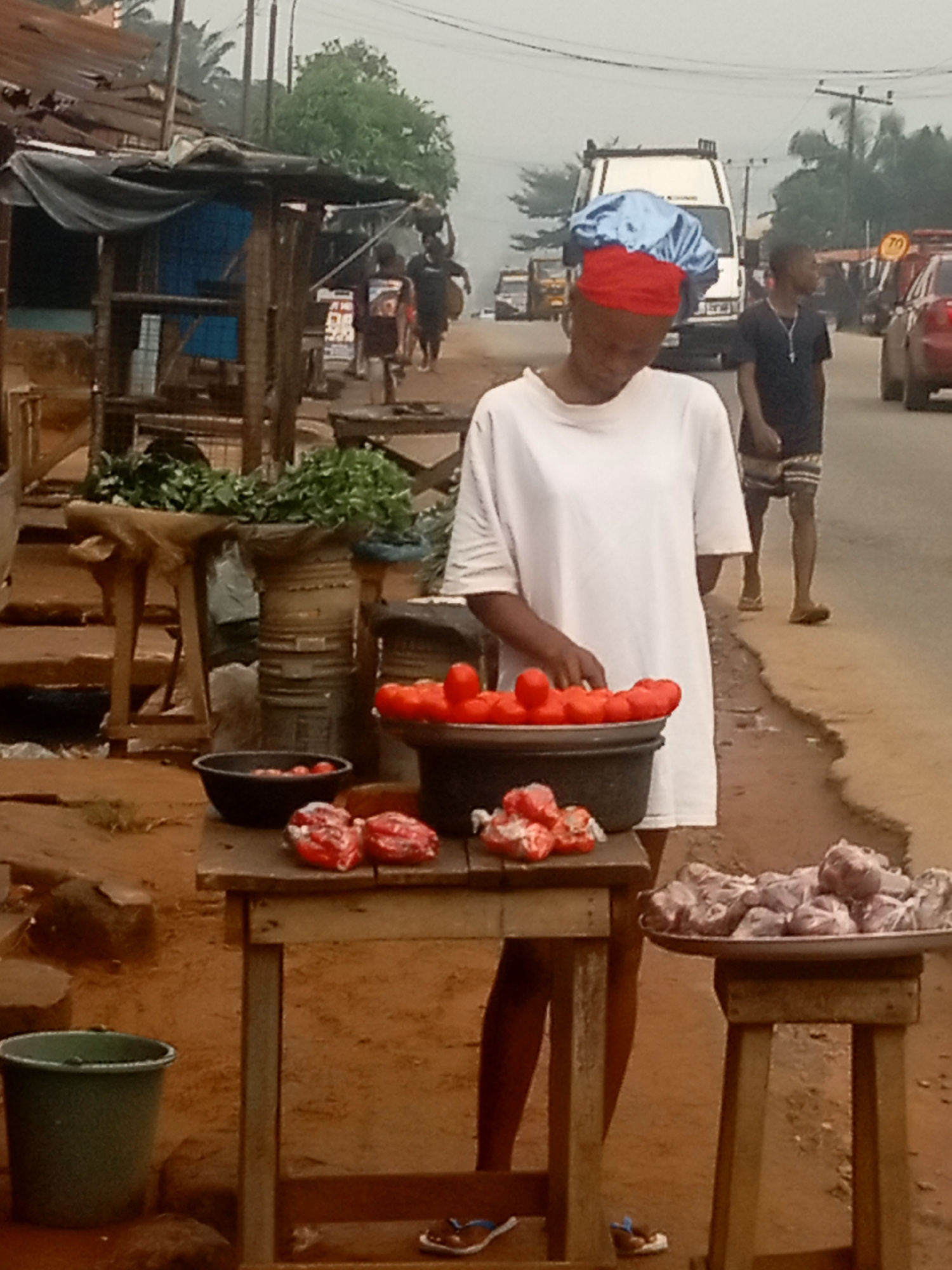 A young woman is standing by a table full of tomatoes, likely in Nkpor, Nigeria. She is wearing a white T-shirt and a red and blue head covering. She is looking down at the tomatoes in a black bucket. On the table, there is also a black bowl of tomatoes and some other packaged items. There is a tray of wrapped meat on a small stool to the right. Behind her, a young man is walking on the sidewalk, and vehicles are visible on the road. There is also a simple wooden structure to the left with green vegetables on top. The ground is reddish-brown, and the weather appears overcast. | Open Wire