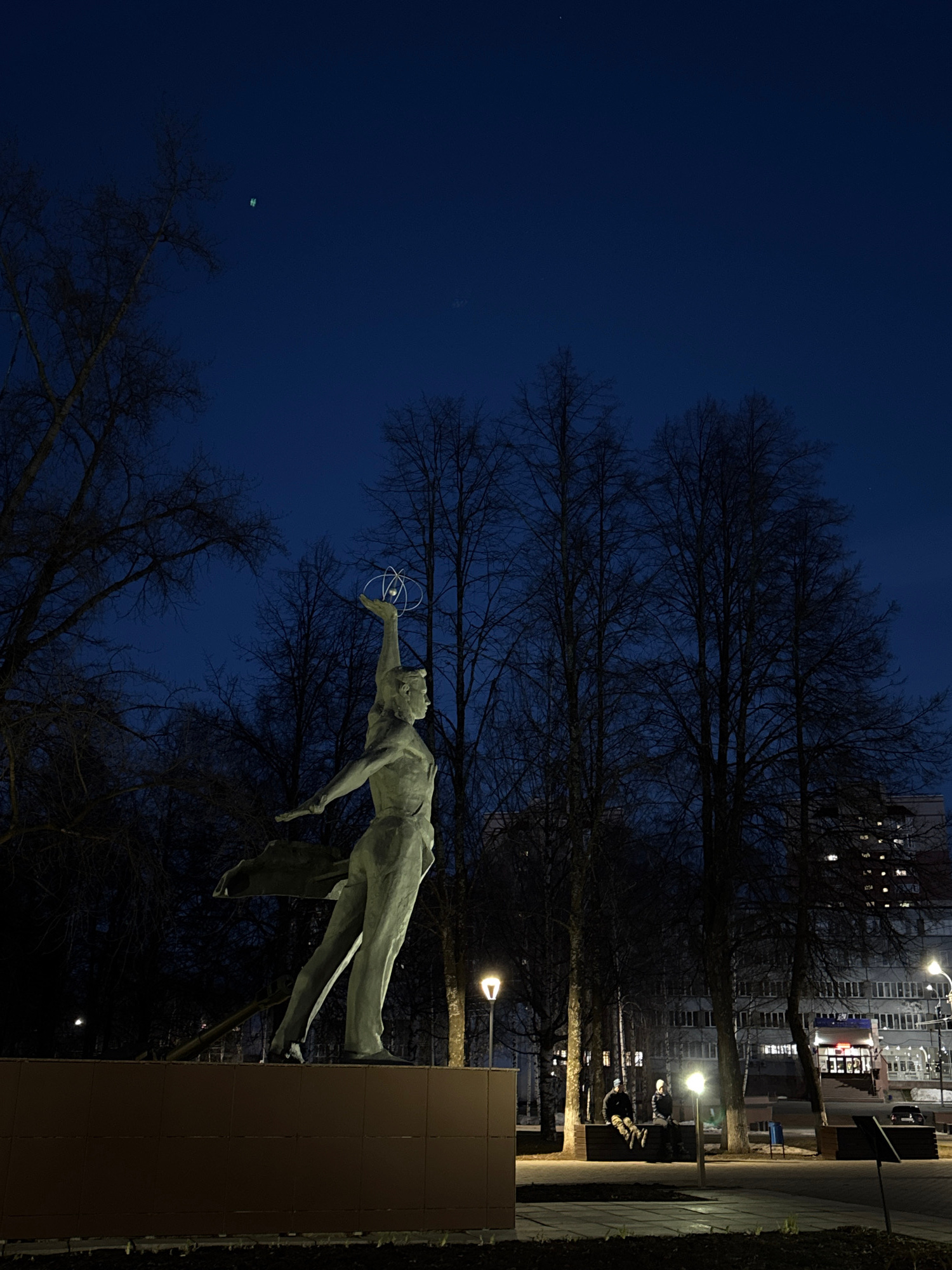 The image shows a statue, "Friendship of Peoples", in Izhevsk, Russia, at night. The statue depicts a man holding a model of an atom. It is mounted on a rectangular base of brown tiles. In the backgro…read more