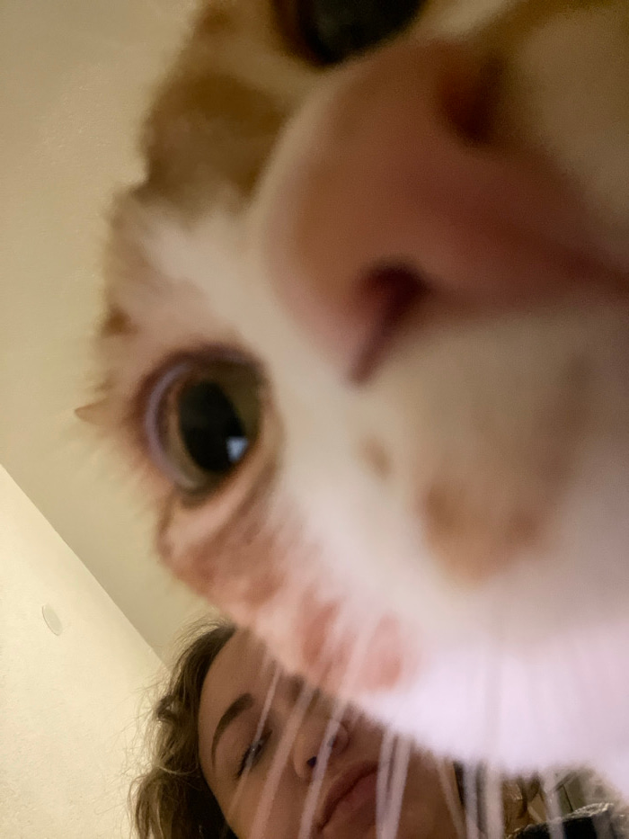 A close-up, distorted view features a cat's face dominating the frame, its nose and one eye highly magnified. The fur is white with tan markings. In the background, partially obscured by what appears…read more