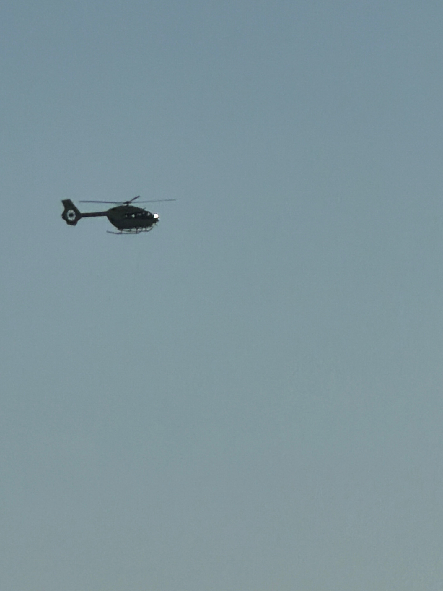 A single dark-colored helicopter is flying in a clear, gray-blue sky. The location is not discernible as the sky is featureless, and there are no discernible buildings or structures to determine a loc…read more