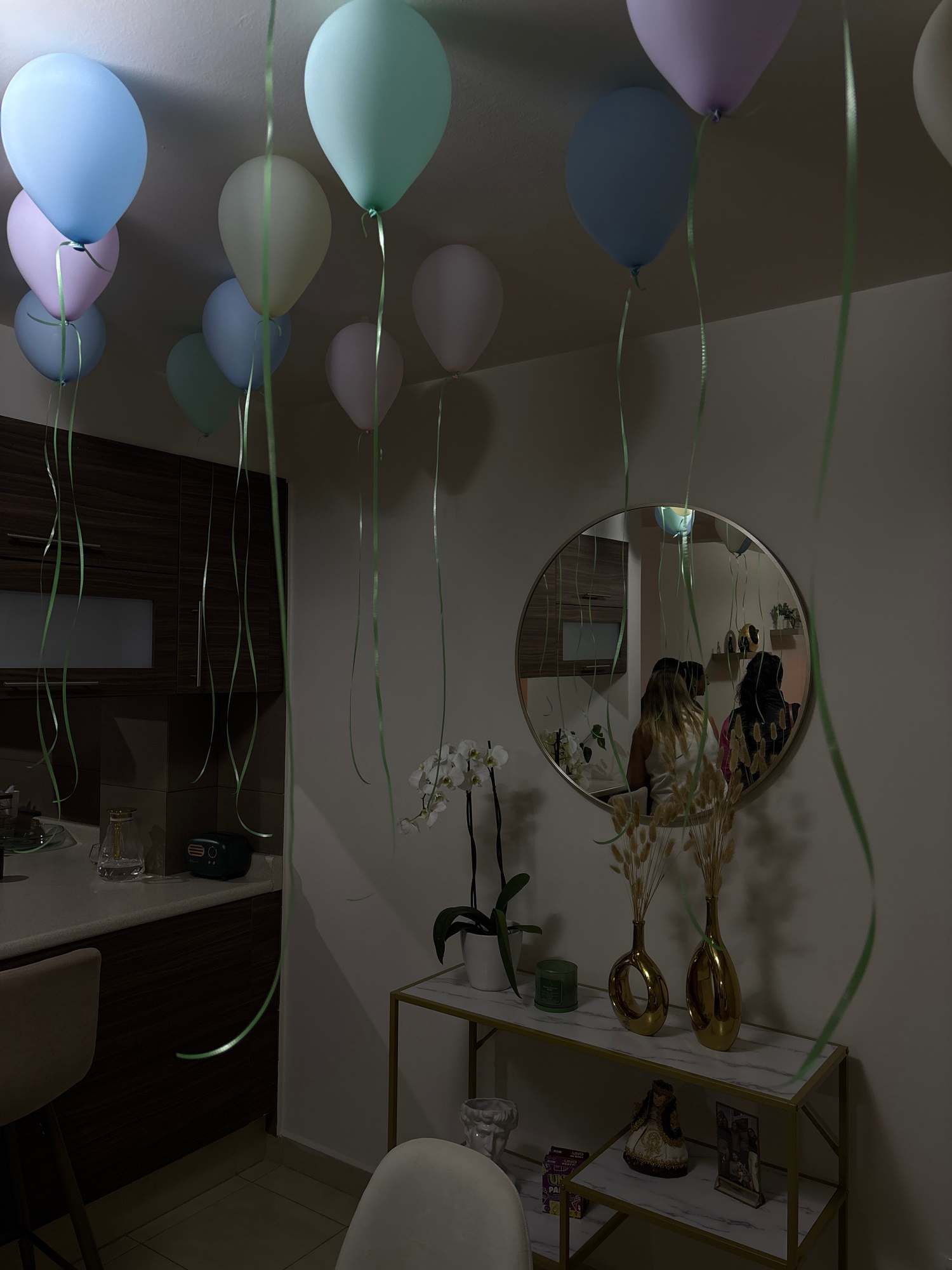 The image depicts an interior space in what appears to be a residence. The walls are light in color, and the lighting is dim. Several balloons in pastel shades of blue, purple, pink, and white are sus…read more