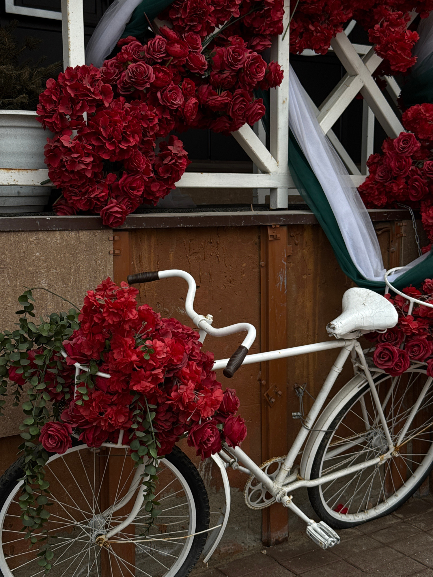 A white bicycle is propped against a brown-painted building exterior, adorned with large clusters of dark red roses. The bicycle's seat shows signs of wear, and its handlebars are partially obscured b…read more