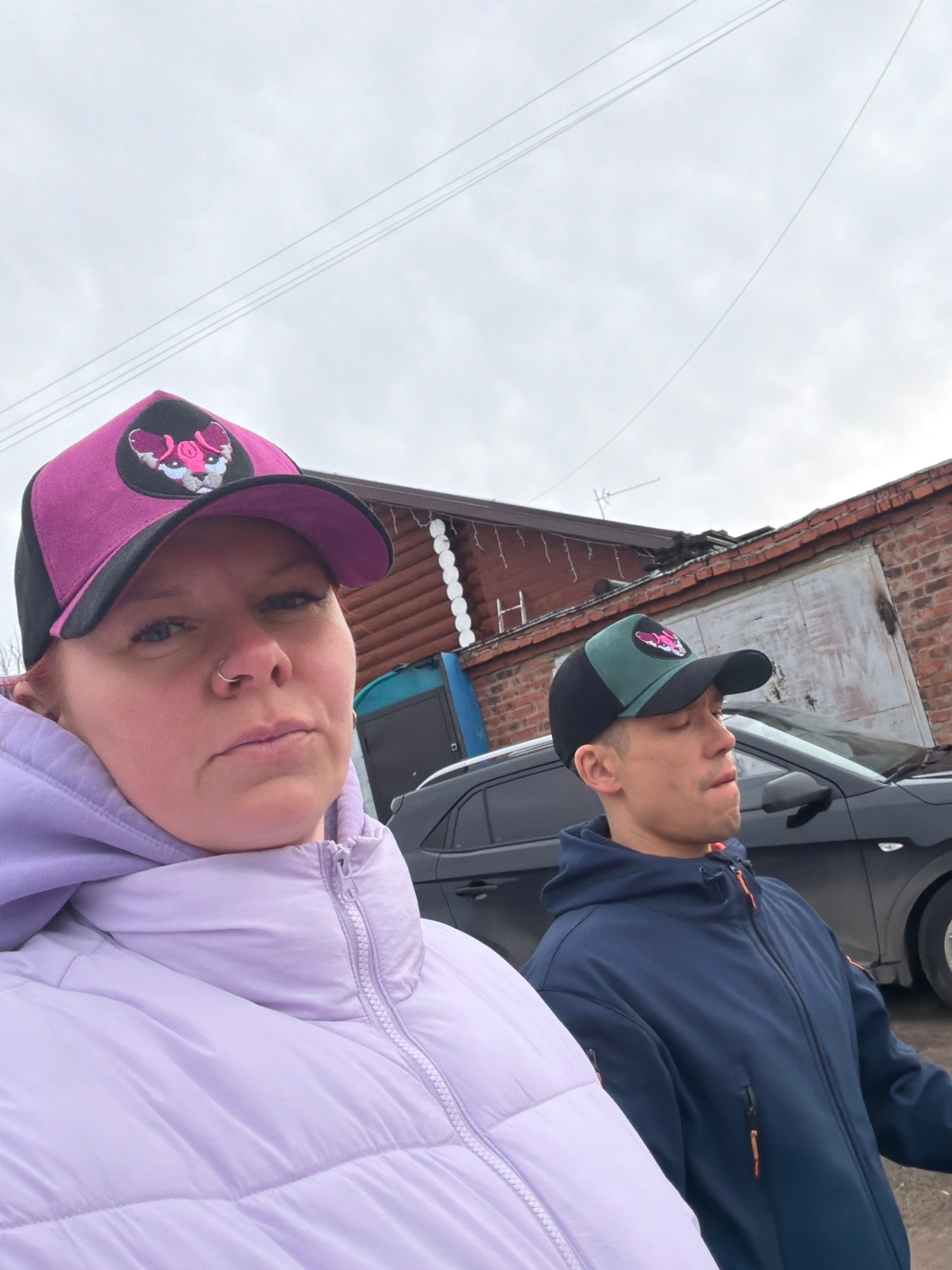 Two individuals are visible in an outdoor setting, likely in Chaikovsky, Russia. One person wears a lilac-colored quilted jacket and a purple baseball cap with a pig patch. The other person is wearing…read more