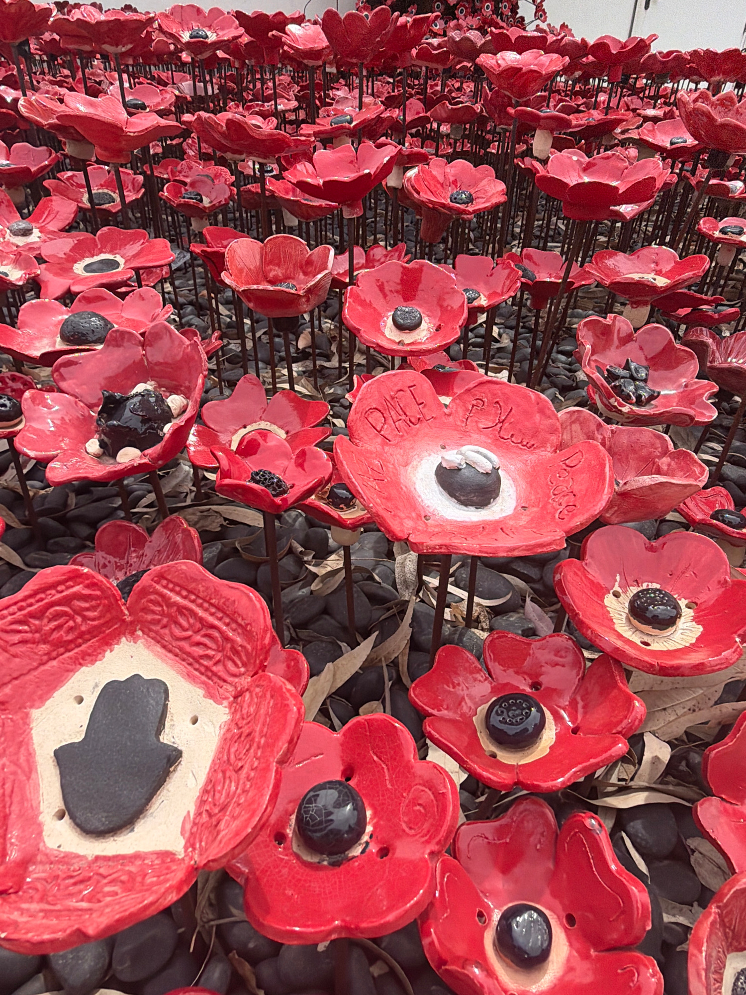 The image shows a field of ceramic poppies planted on iron rods. The poppies are red with black centers, and some have inscriptions, including the word "Peace" written in both English and Arabic. The…read more
