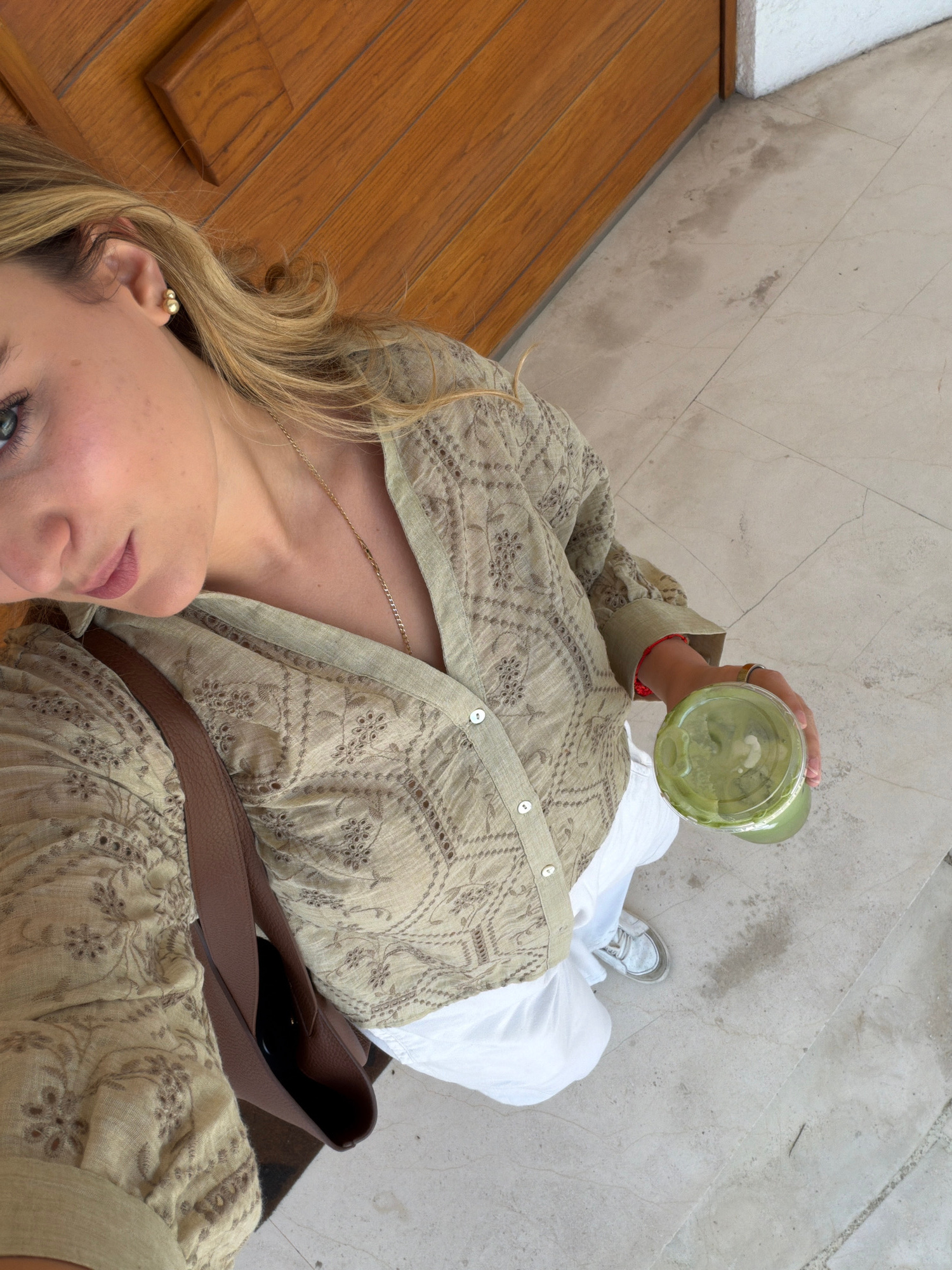 The image shows a person holding a green drink in a plastic cup. They are wearing a patterned, button-down shirt, white pants, and sneakers. A brown bag with a strap is visible. The background consist…read more