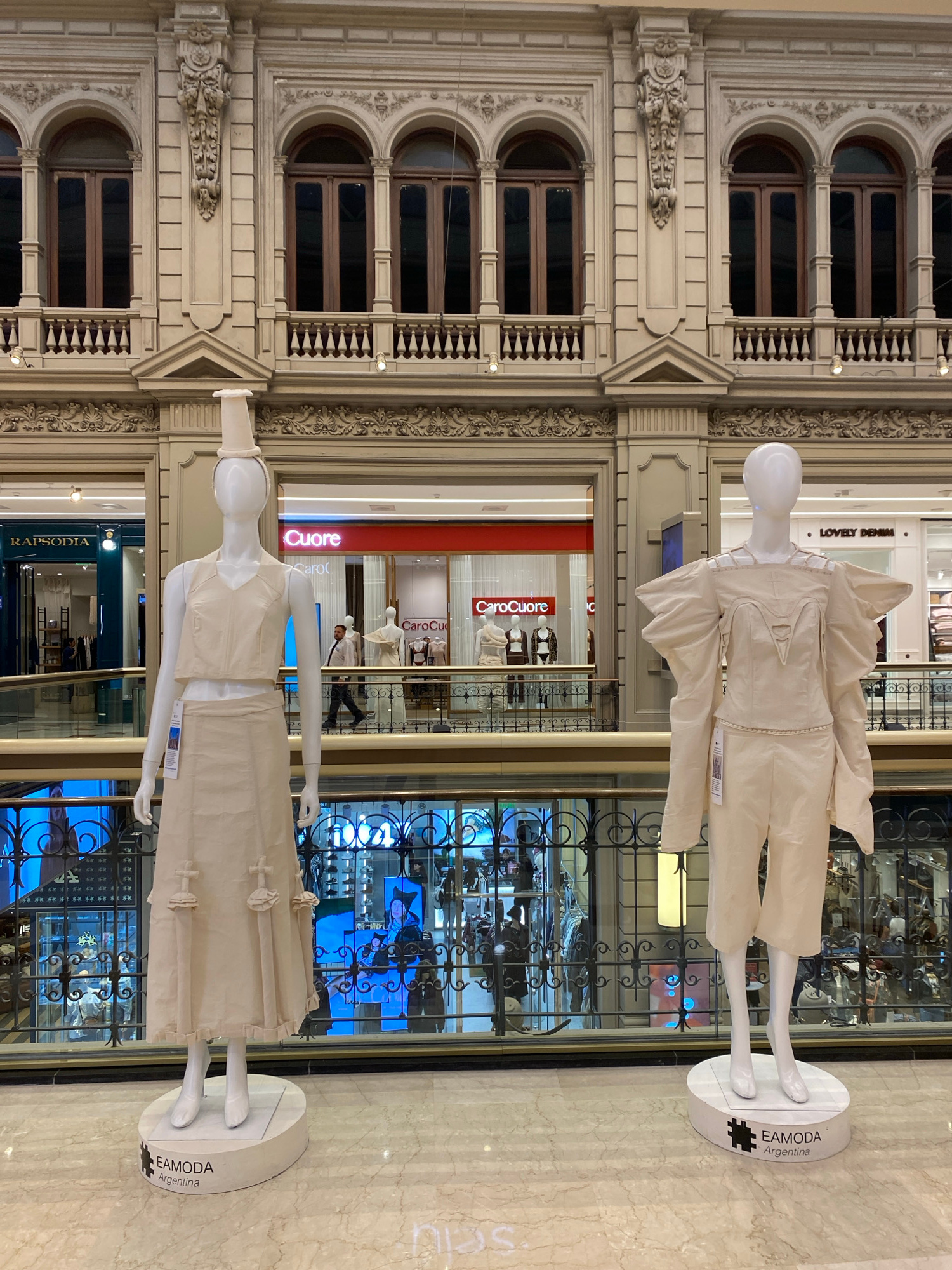 The image captures an interior scene at Galerías Pacífico in Buenos Aires, Argentina. Two mannequins stand on pedestals labeled "EAMODA Argentina," displaying minimalist off-white outfits. They are po…read more