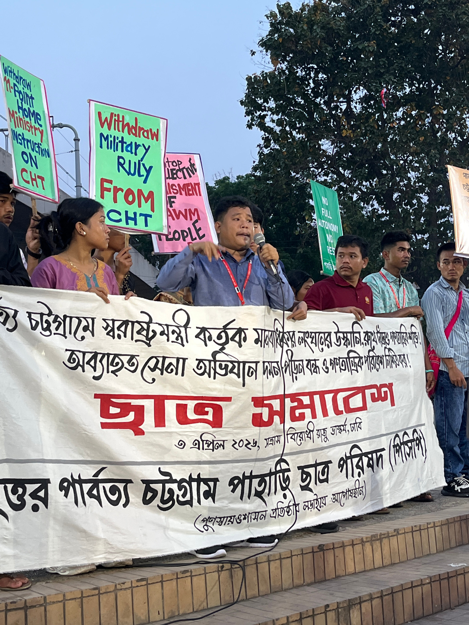 A street-level photograph captures a demonstration in Dhaka, Bangladesh. The event, identified as a "Student Rally," features individuals holding protest signs and a large banner. Some of the signs ar…read more