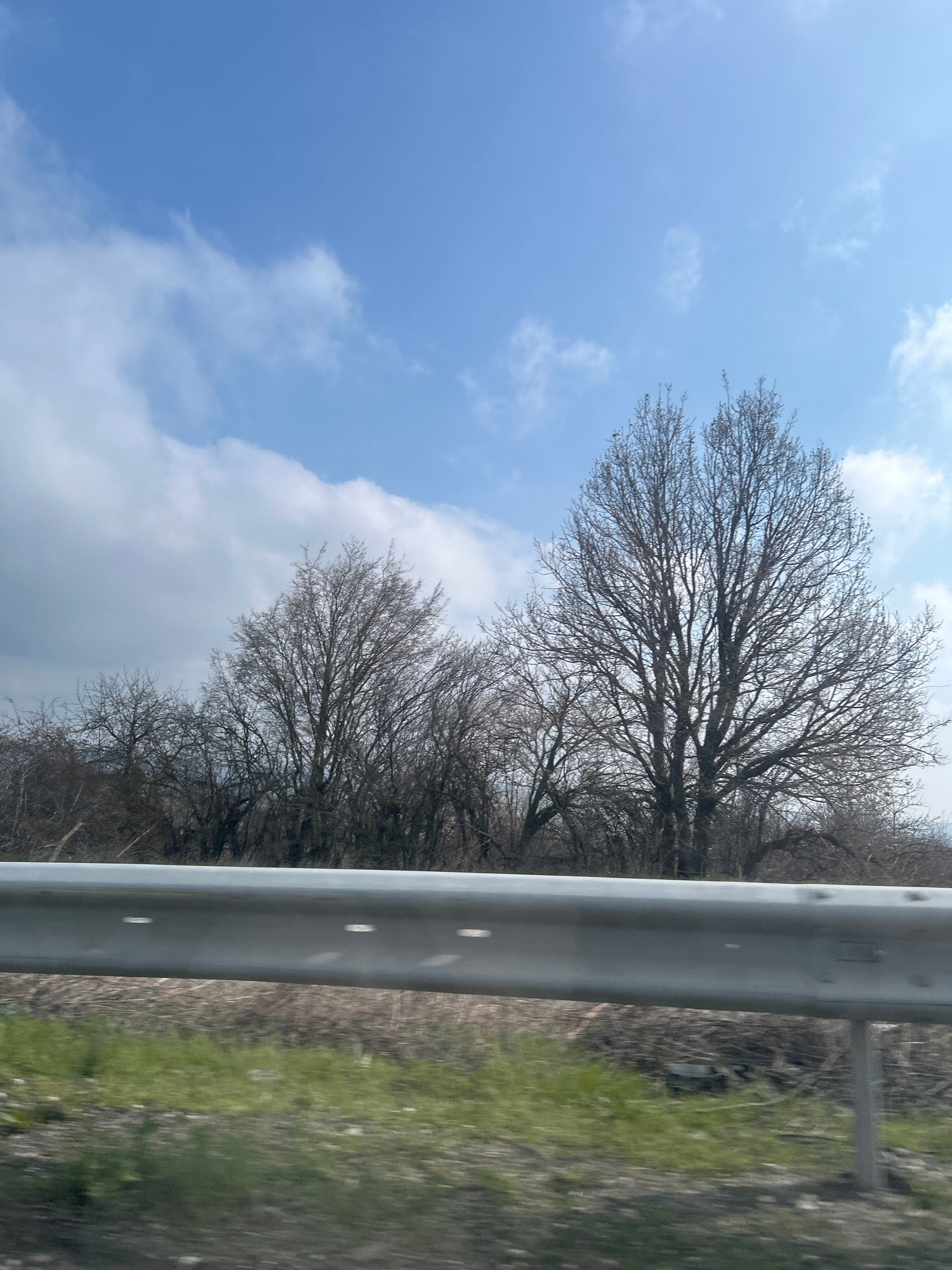 A roadside view features a silver guardrail prominently in the foreground, with a backdrop of bare trees against a sky with scattered clouds. Patches of green vegetation are visible on the right side…read more