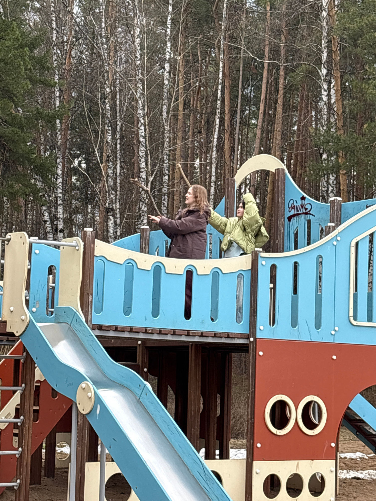 Two individuals are on a multi-tiered playground structure, possibly in Chaikovsky, Russia. One person is in a light green jacket and another is in a dark brown jacket. The person in the brown jacket…read more