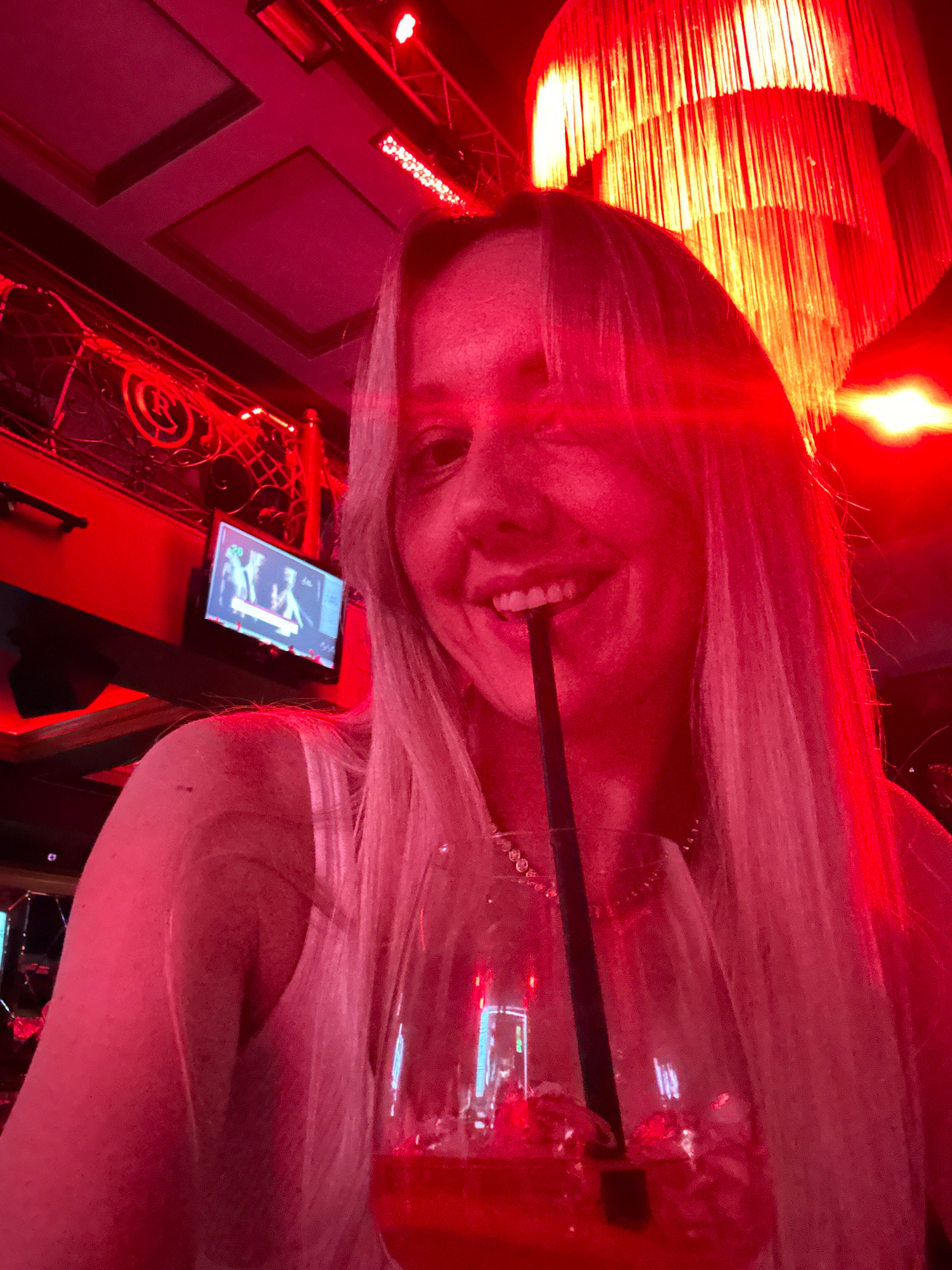 A woman with long blonde hair is seen indoors, illuminated by red lighting. She is holding a clear plastic cup with a dark straw in her mouth, smiling slightly. In the background, there is what appear…read more