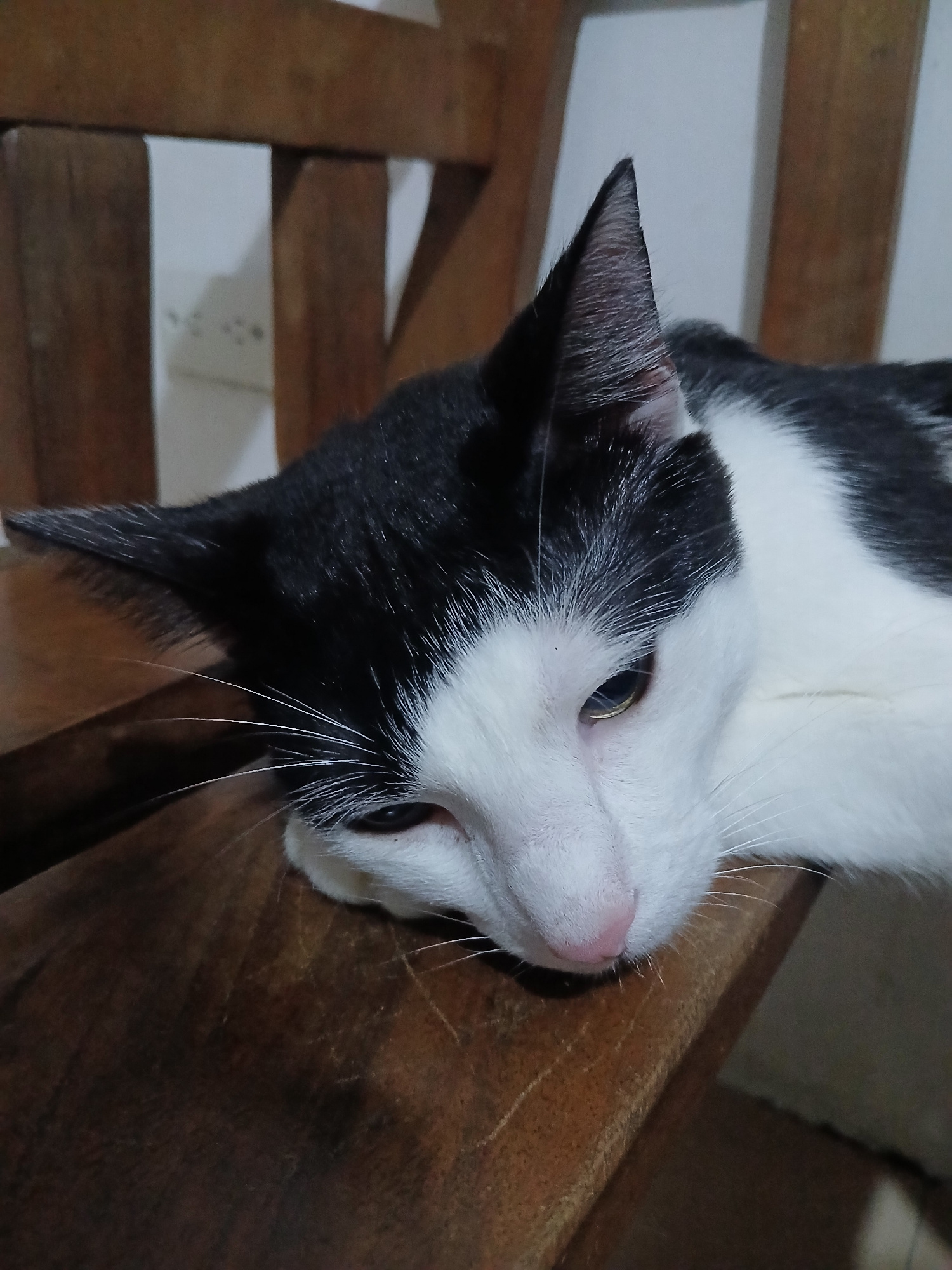 A black and white cat is lying on a wooden surface. The cat's head is tilted towards the camera, and its body is partially visible. The cat is in a domestic setting, likely indoors. The image was takeβ¦read more