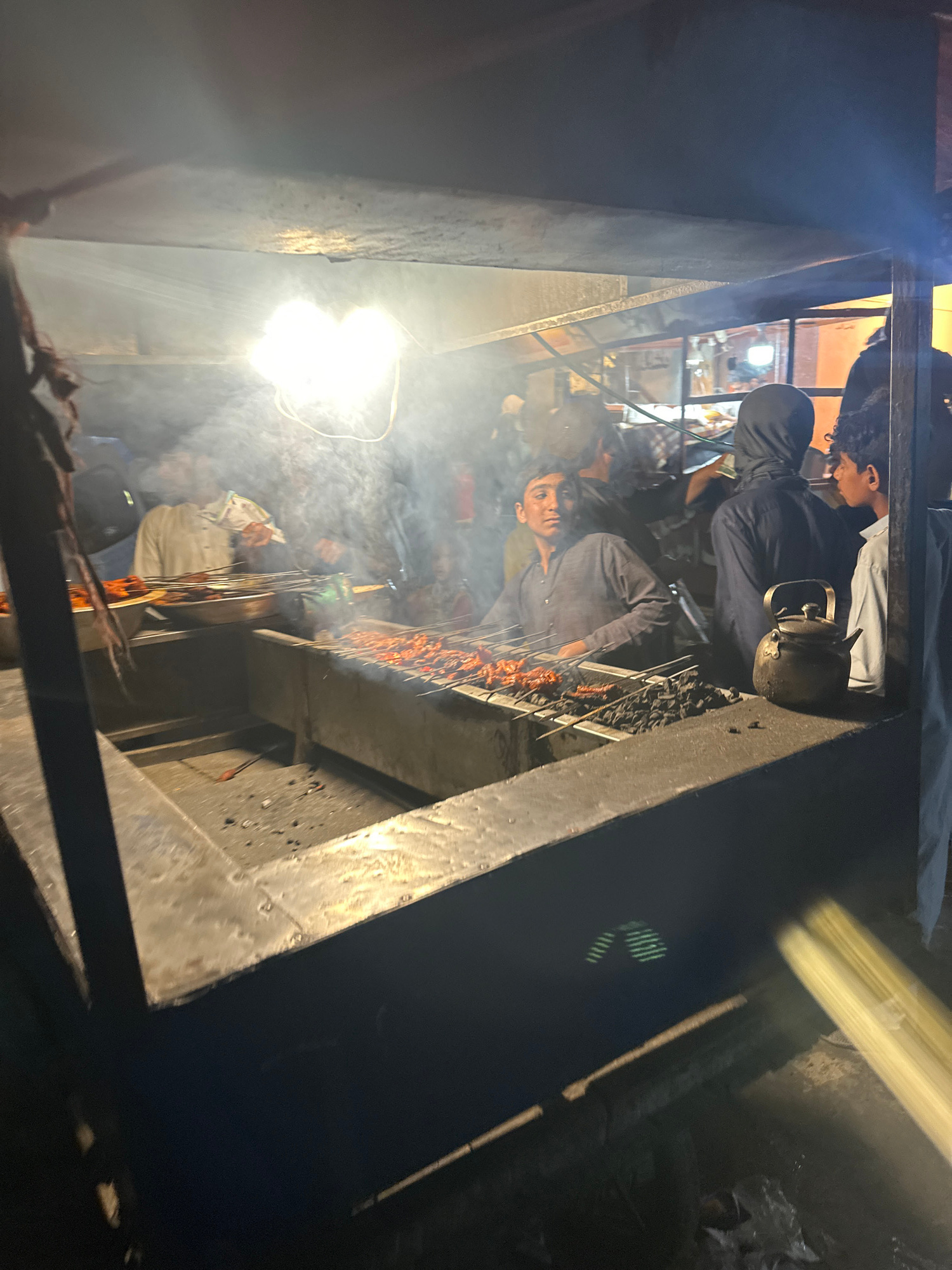 This vertically oriented image captures a dynamic night scene within a bustling street food stall or small eatery in Quetta City Tehsil, Pakistan. The setting is illuminated by bright artificial light…read more