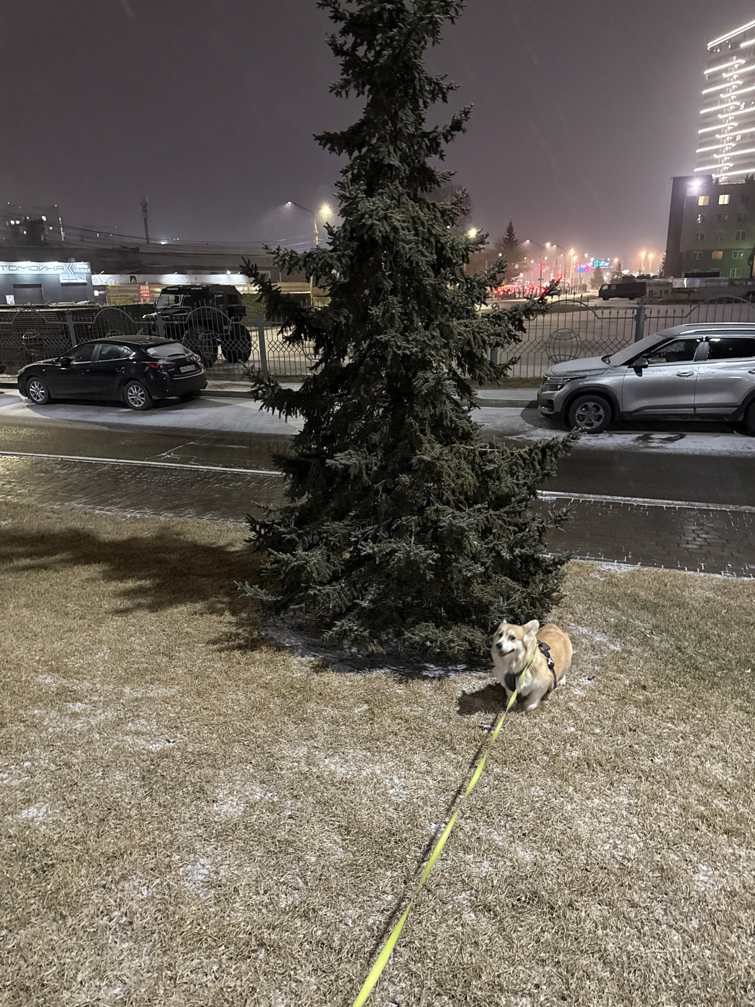 The image depicts a nighttime scene in Krasnoyarsk, Russia. A small, tan corgi dog is on a yellow leash, standing on a patch of grass that appears frosty or lightly snow-covered. Beside the grass is a…read more