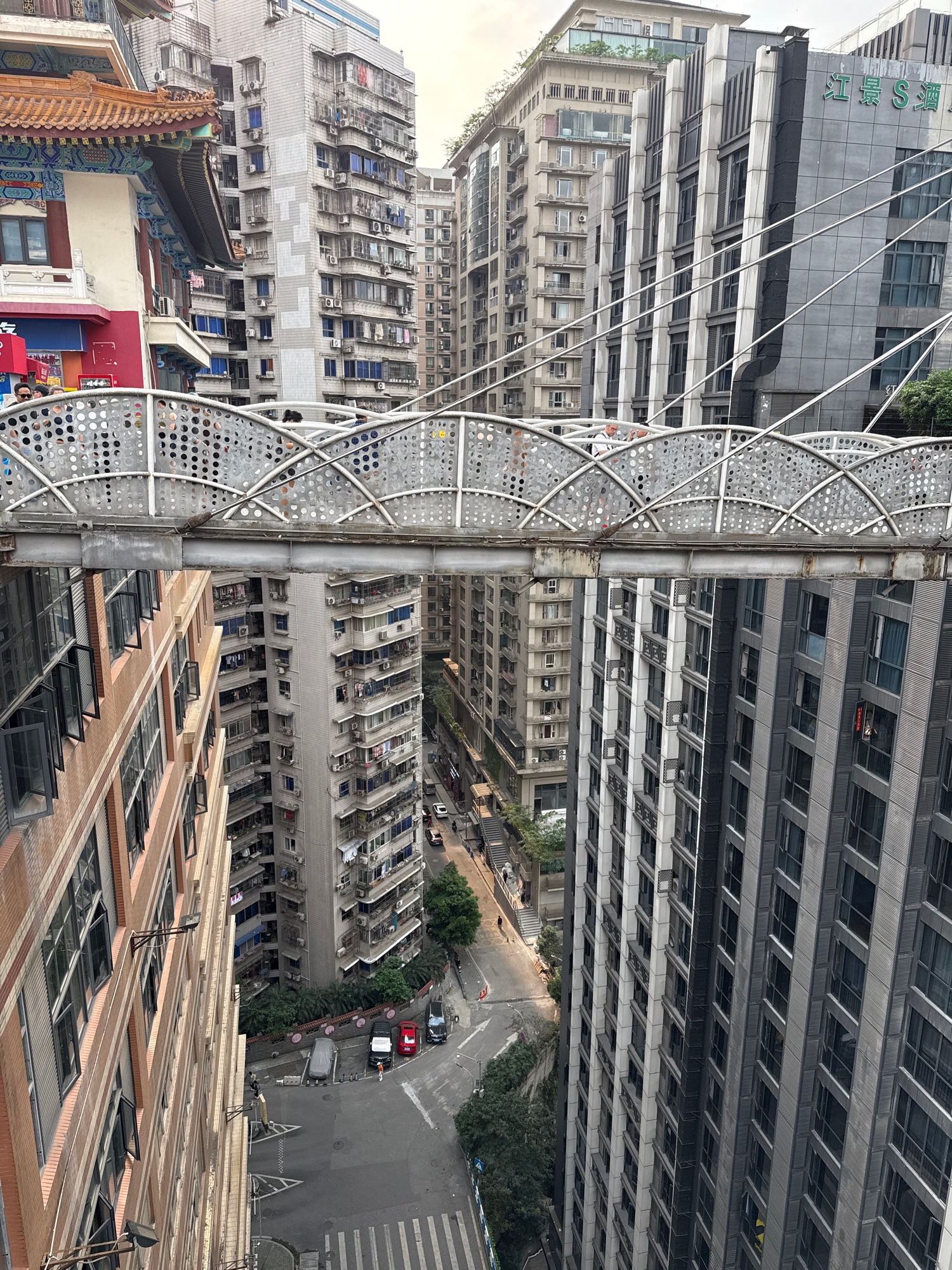 A high-angle, eye-level shot depicts a dense urban environment in Yuzhong District, China, characterized by a mix of architectural styles. Several high-rise buildings dominate the skyline, constructe…read more