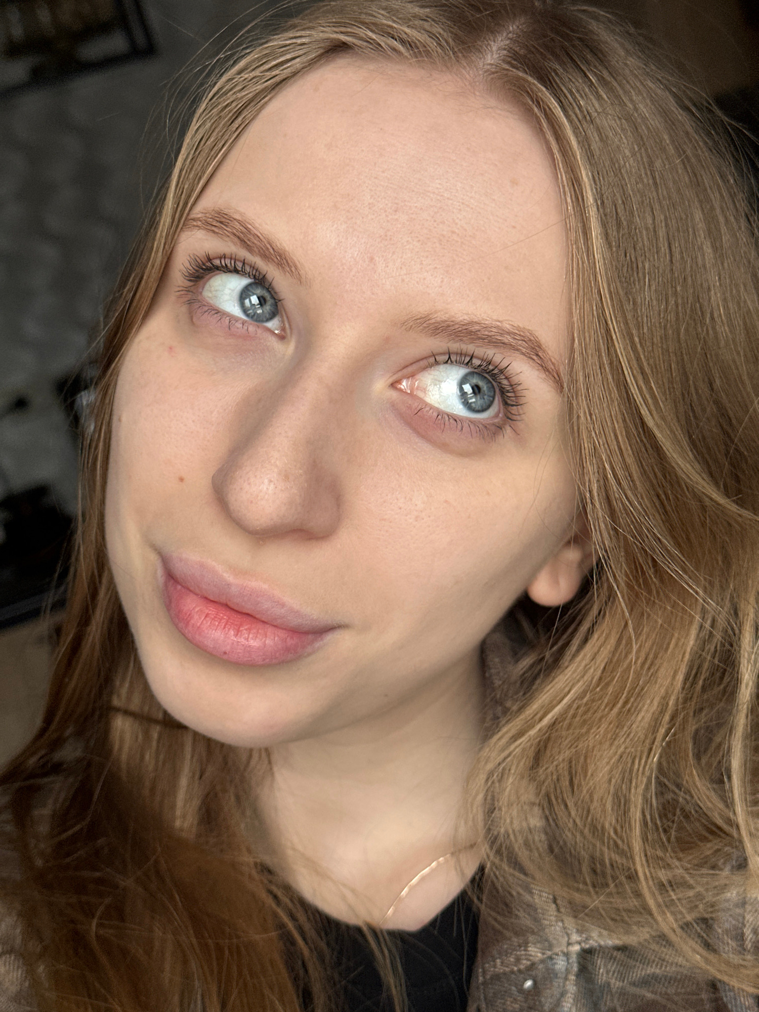 A close-up, angled portrait shows a young woman with fair skin, light brown hair, and light blue eyes looking up and to the left. Her lips are full and pink. Her hair is styled loosely around her face…read more