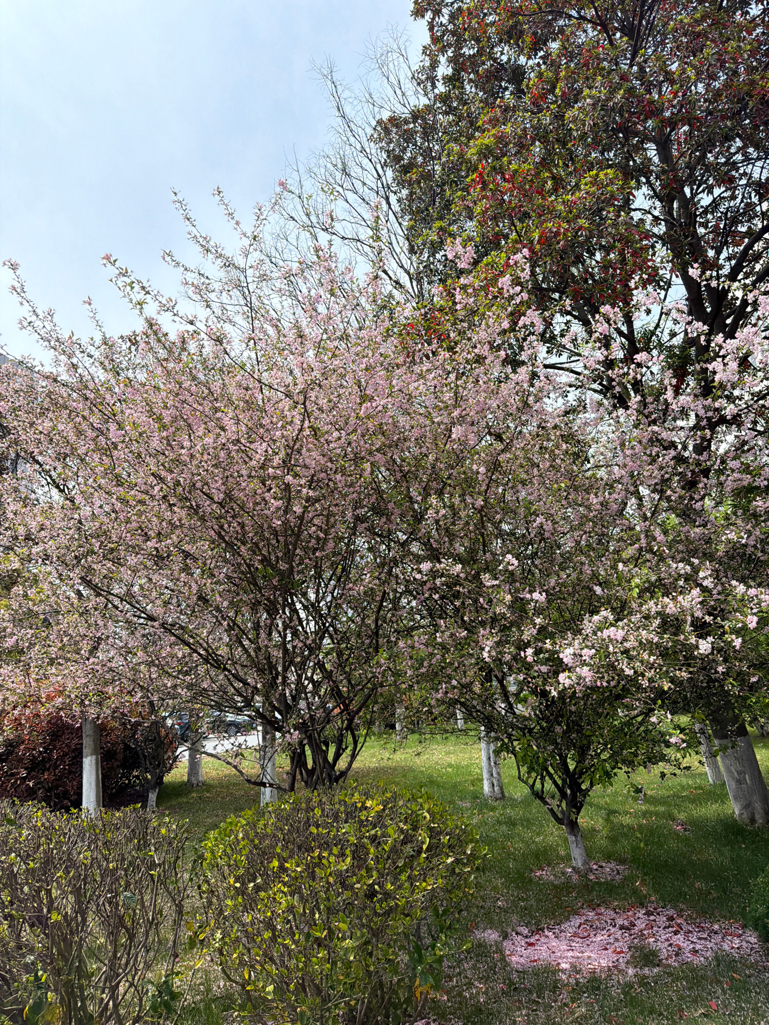 The image shows a park or garden in Jiangning District, China. The sky is a pale blue. There are several trees, including at least one with pink blossoms. Petals from the trees are scattered on the gr…read more