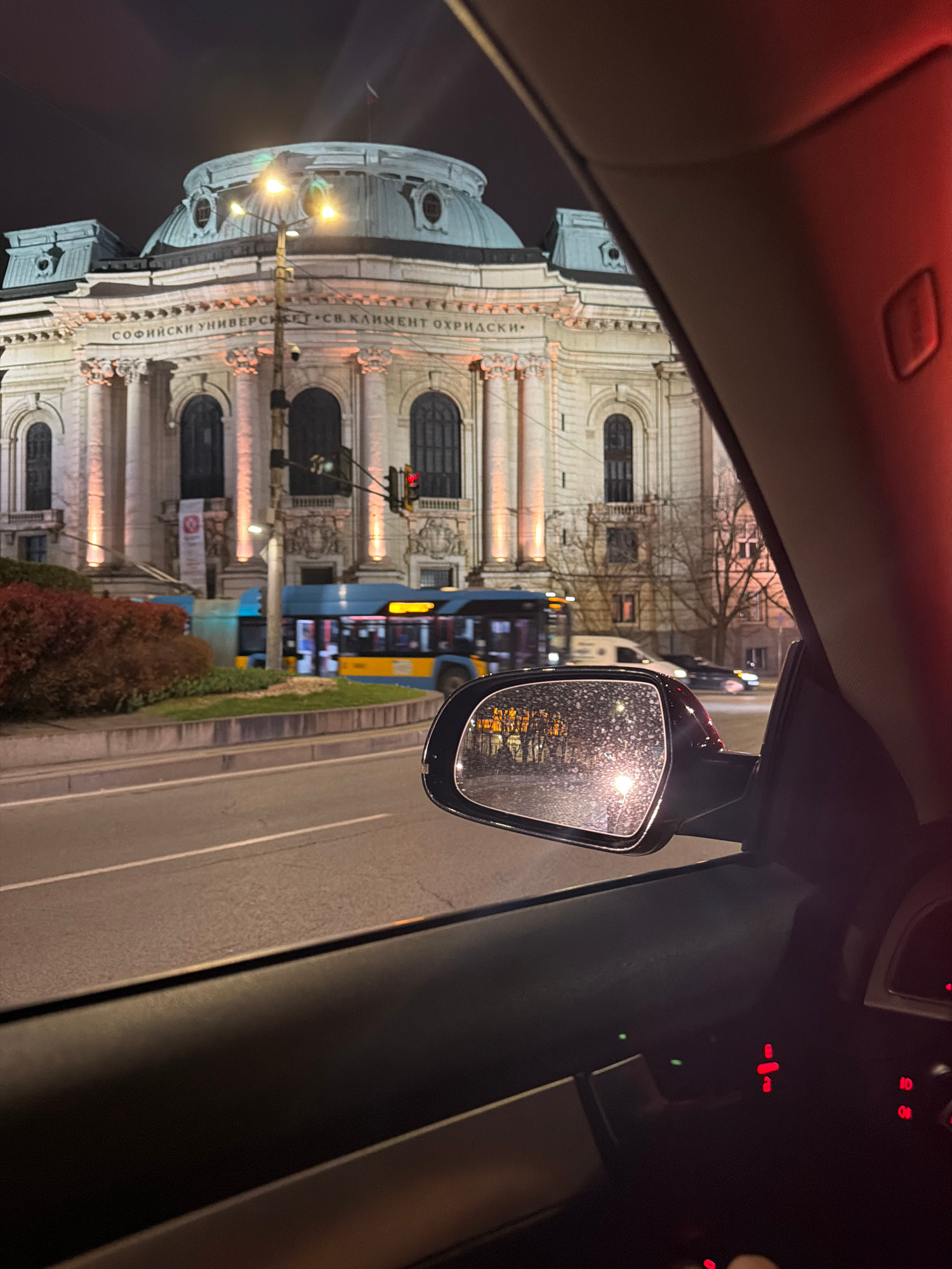 The image shows a view from inside a car at night. The side mirror of the car is visible. In the reflection of the mirror, as well as through the car window, the Sofia University "St. Kliment Ohridski…read more