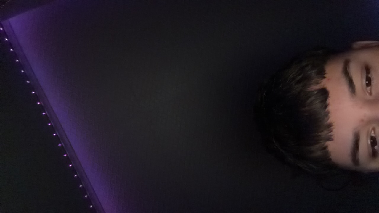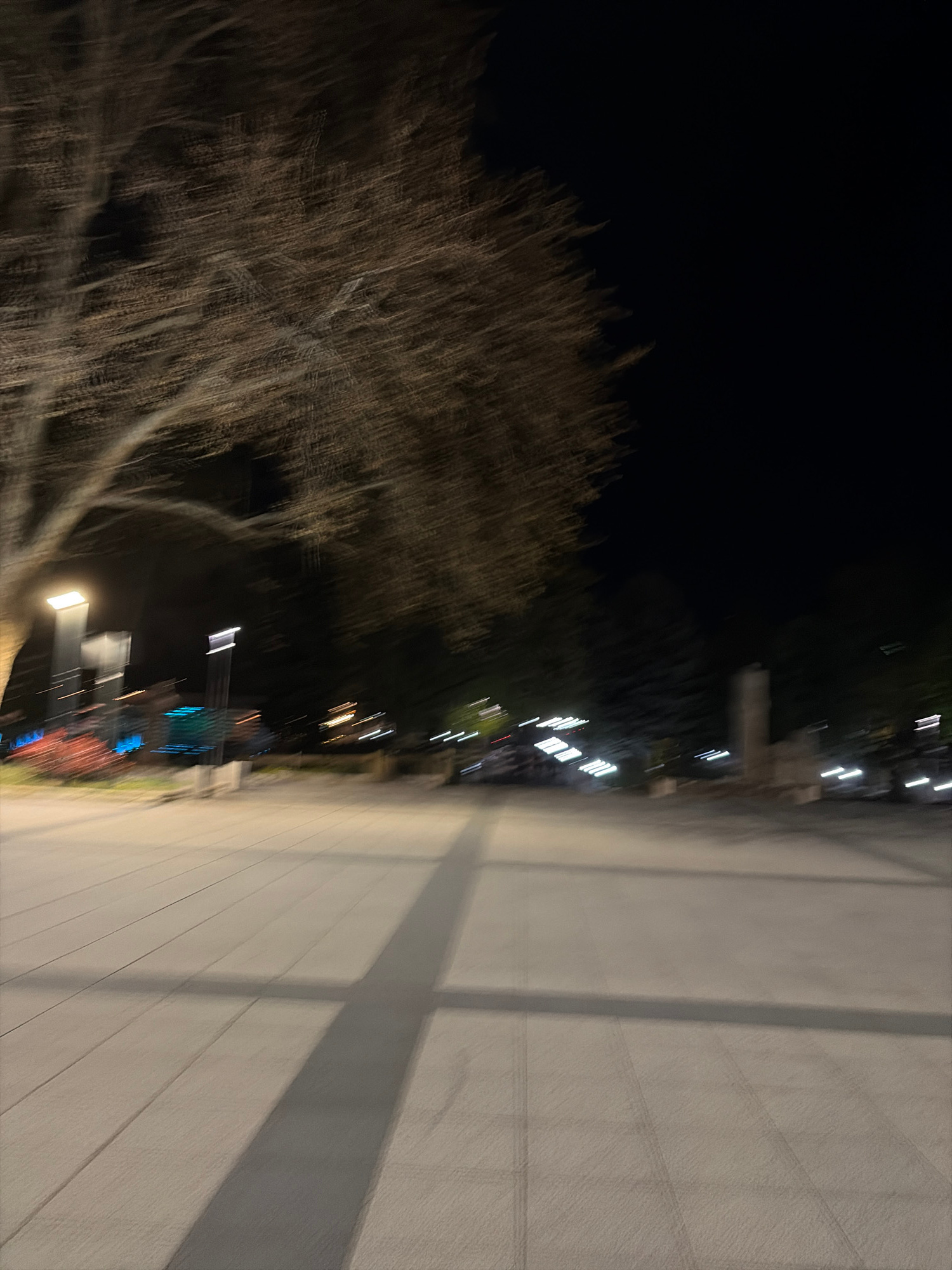 The image appears to be a blurry, rotated long exposure shot taken at night. The right side of the image shows a concrete surface, likely a sidewalk or plaza, illuminated by artificial light and displ…read more