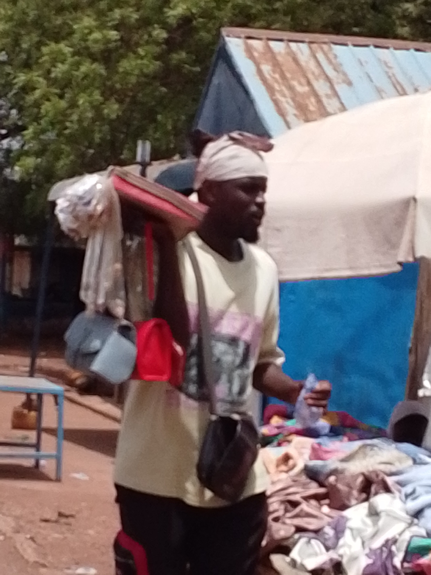 In a sunlit outdoor setting in Tamale, Ghana, a dark-skinned man with a headscarf is seen carrying goods. A variety of bags hang from his shoulder. In his right hand, he holds a small plastic item. Ad…read more
