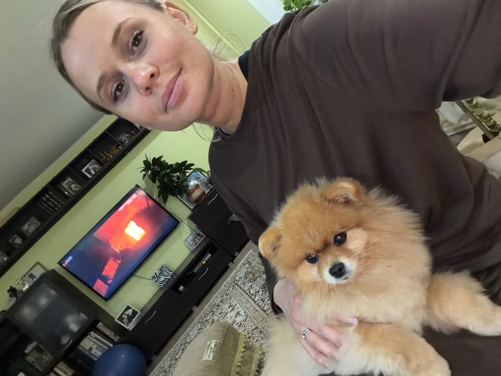 A woman holds a Pomeranian dog. A television is on a shelf showing a film called "Дом кино HD" and it is 19:55, presumably in Sarapul, Russia.