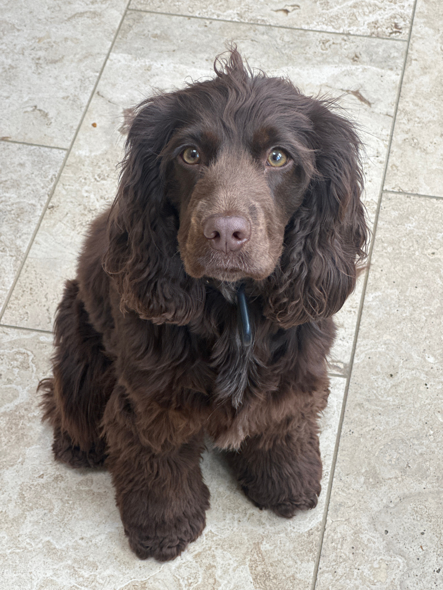 A medium-sized, brown, curly-haired dog lies on a tile floor with its head tilted, looking upward. The dog is wearing a dark-colored collar. The tile floor is light gray with a subtle pattern. The loc…read more