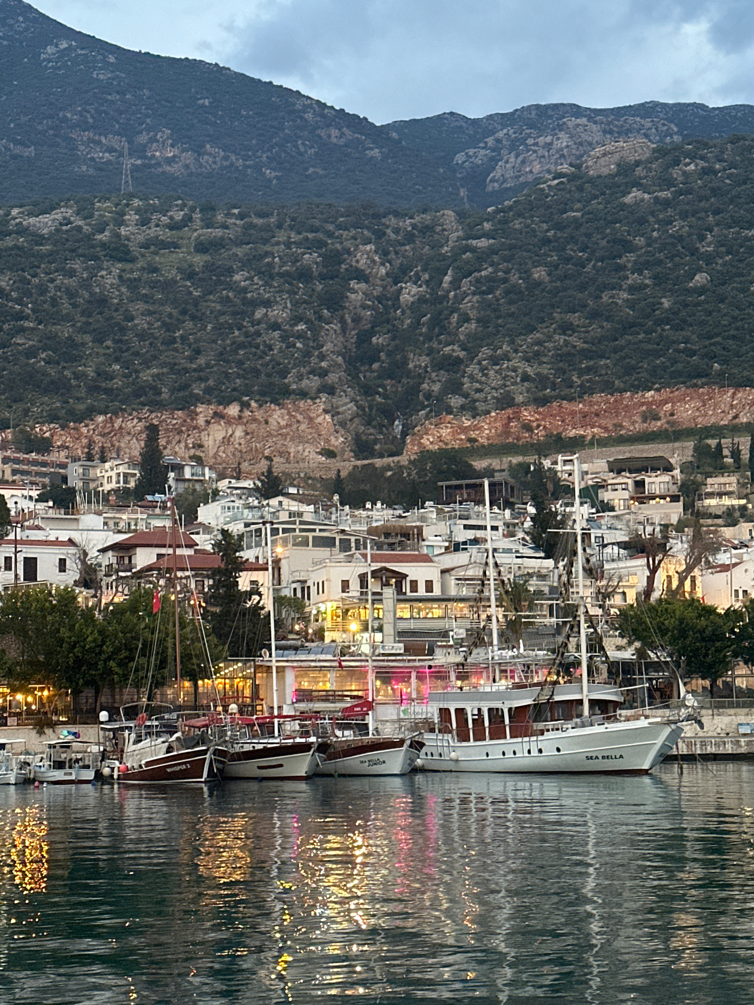 The image shows a waterfront scene in Kaş, Turkey at dusk. A large mountain covered in green vegetation and some reddish rocky sections rises sharply on the left side of the frame. A cluster of white…read more