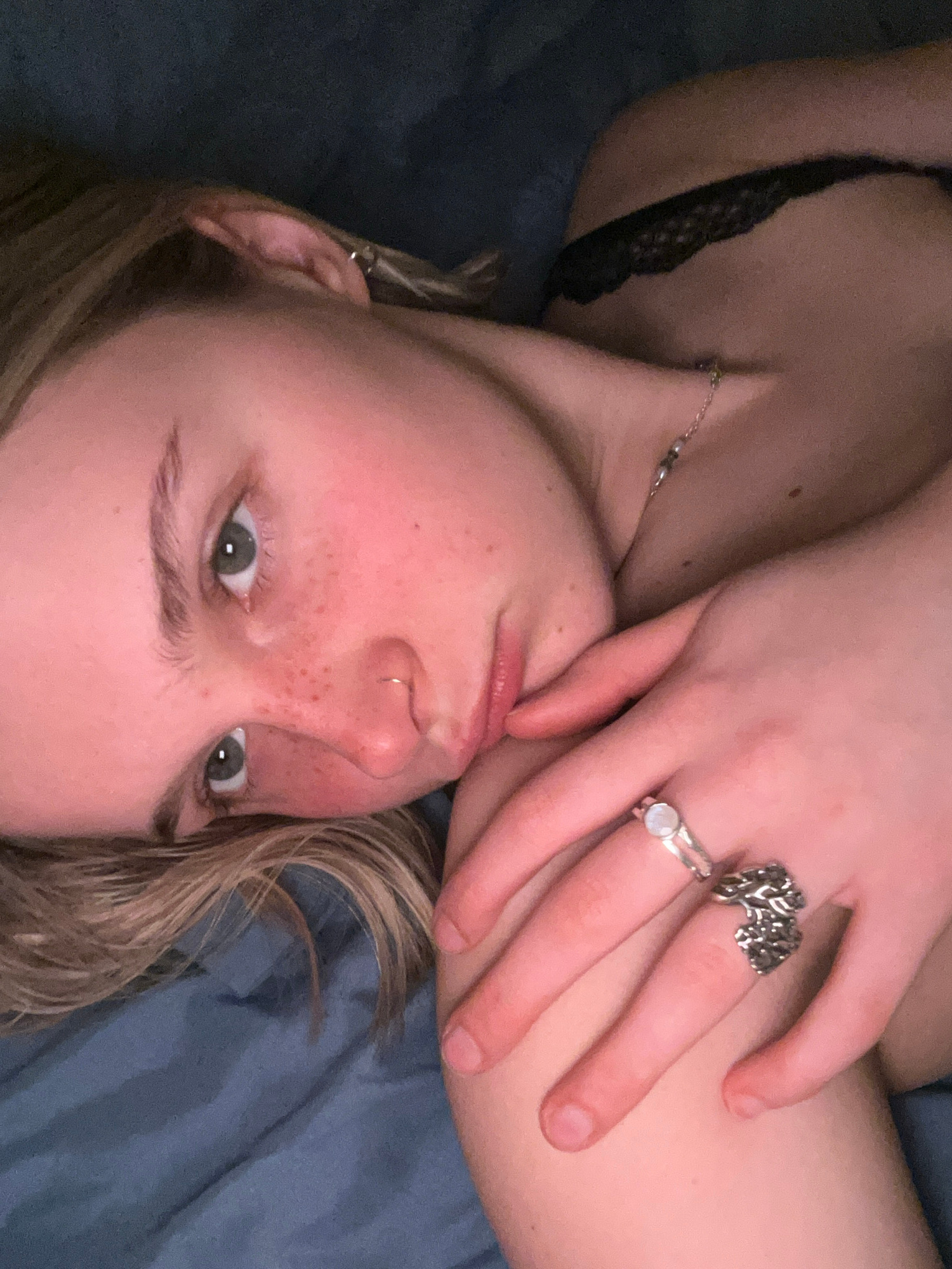 A young adult female with fair skin, freckles, and shoulder-length blonde hair poses in a supine position on a blue fabric surface, possibly a bed or blanket. She wears a black lace garment near her c…read more