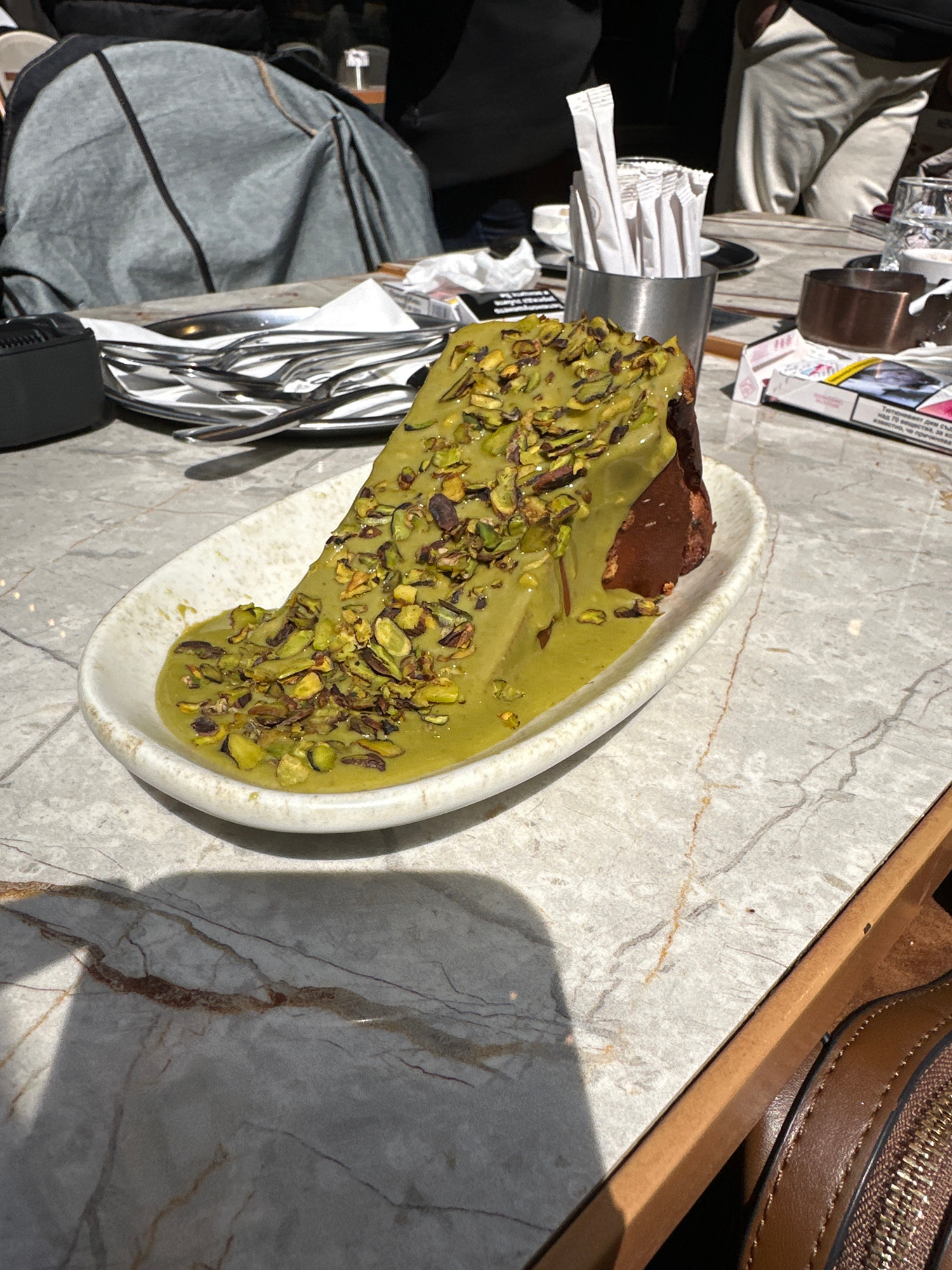 A high-angle shot shows a plate of dessert topped with pistachios in Beyoğlu, Turkey. The dessert, which appears to be cake or pastry, is drizzled with a green sauce and heavily garnished with chopped…read more