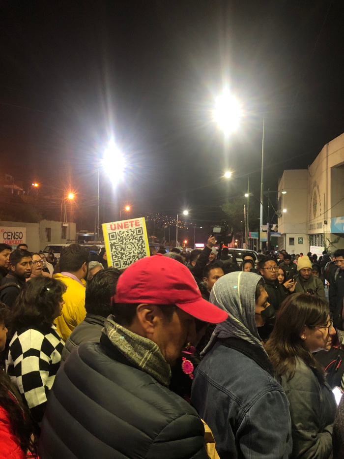 A crowd gathers at night, illuminated by bright streetlights. People of diverse ages and appearances are visible, some wearing hats and warm clothing. A sign with a QR code and the word "ÚNETE" is hel…read more