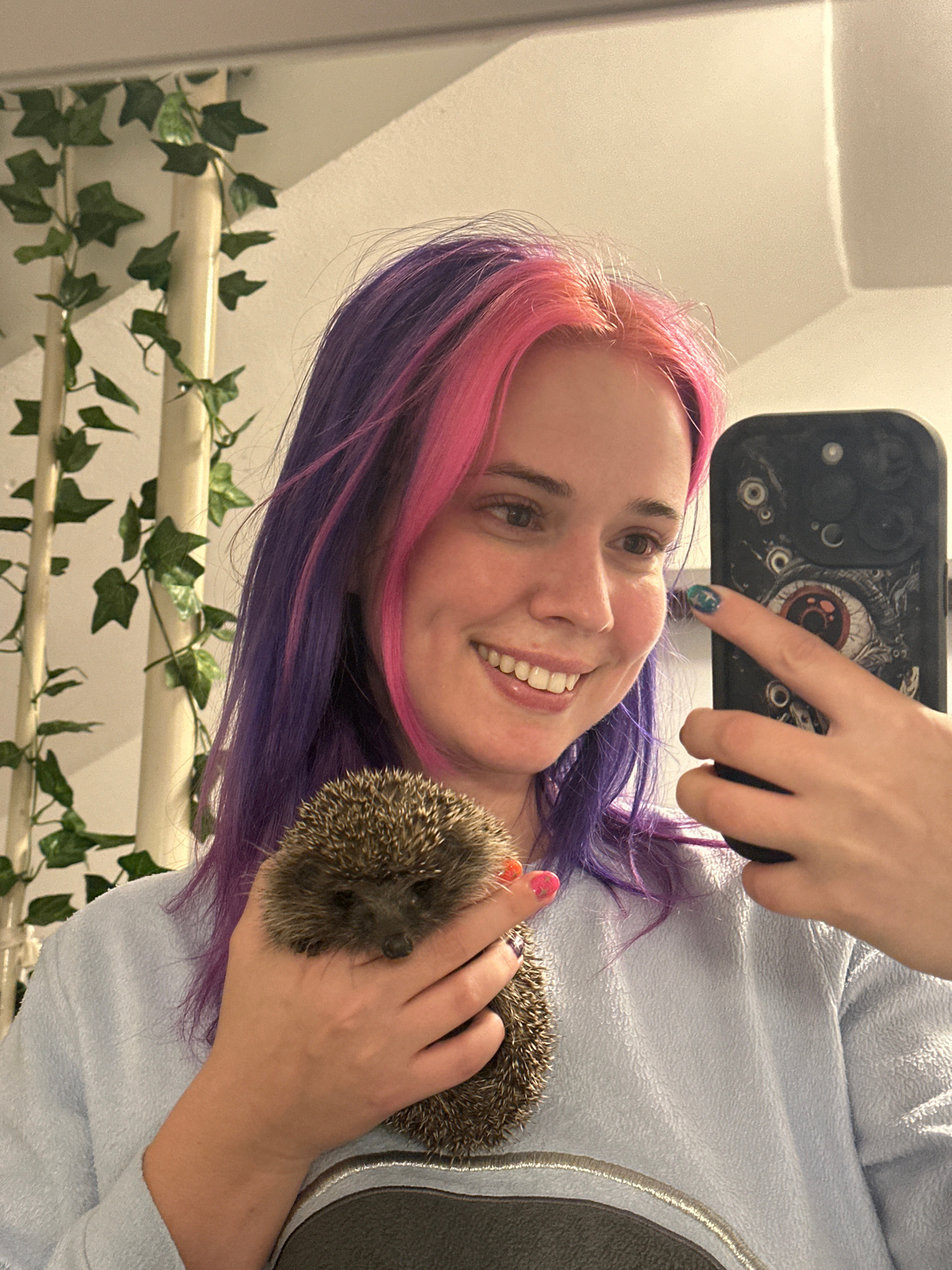 A woman with pink and purple hair is holding a hedgehog and taking a selfie. The phone has an eye-themed case. The background includes a staircase railing decorated with artificial ivy. The location a…read more