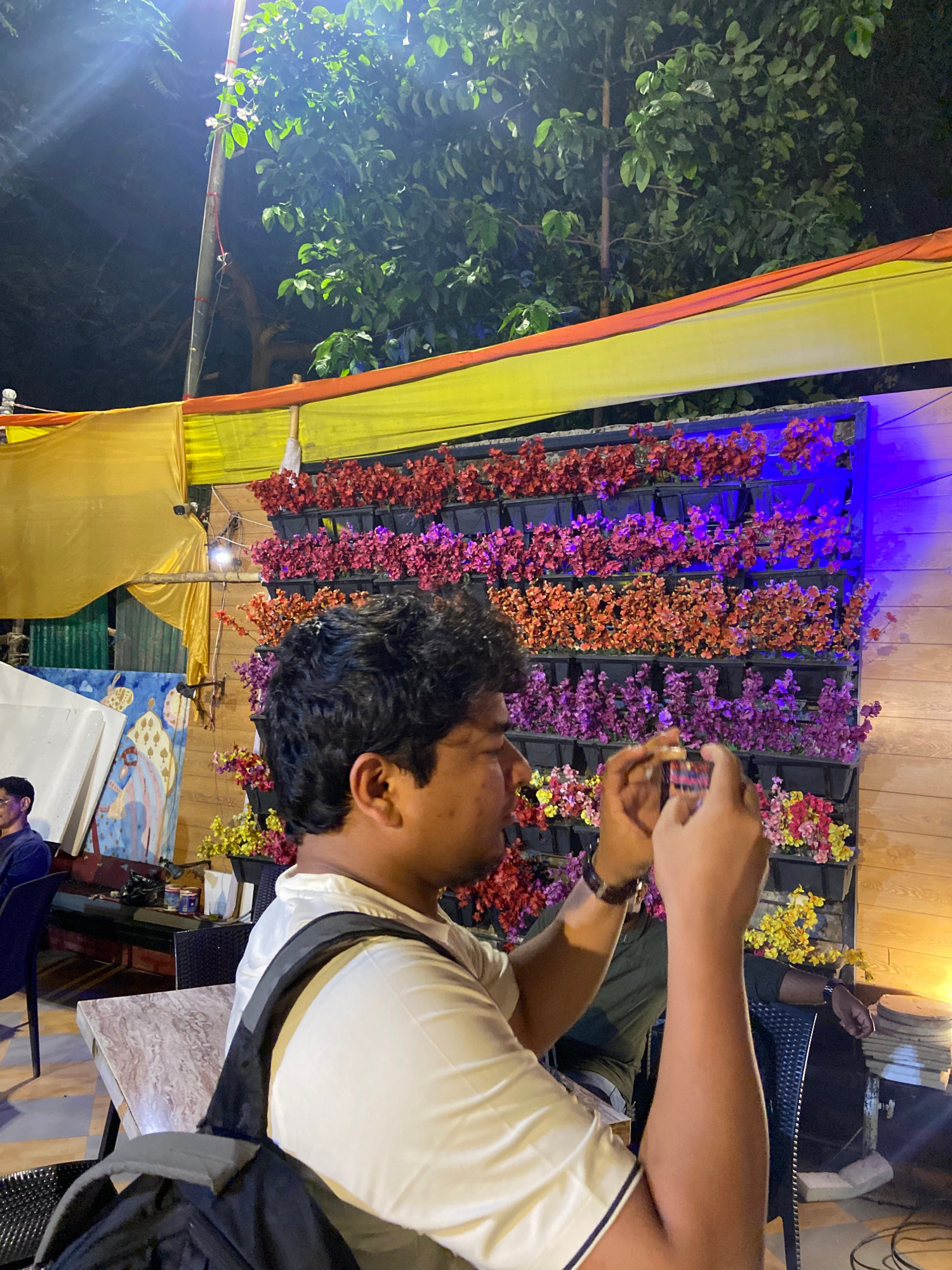 The image depicts an outdoor scene, likely at night, decorated for an event in Dhaka, Bangladesh. A man with dark, curly hair is taking a picture of a floral display, consisting of rows of vibrant flo…read more