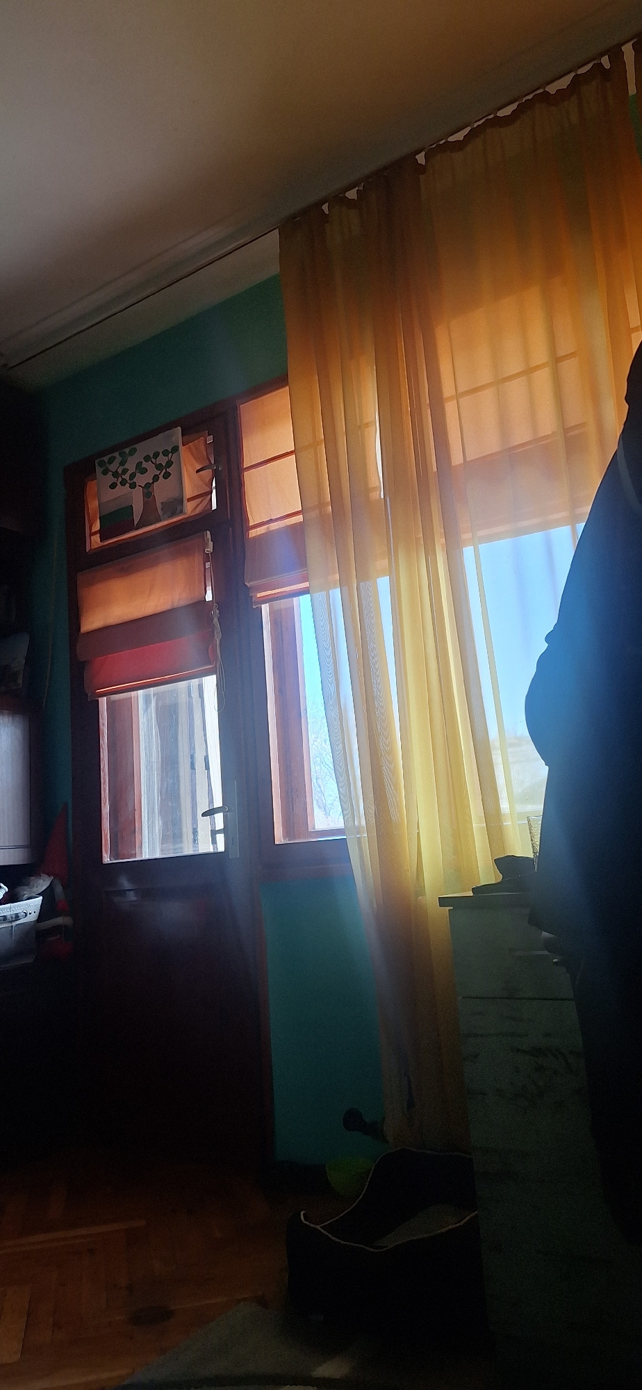 The image depicts an interior scene with two adjacent windows. Both windows are covered by transparent, gold-colored curtains. The upper window reveals a view of a clear, blue sky. The lower window ha…read more