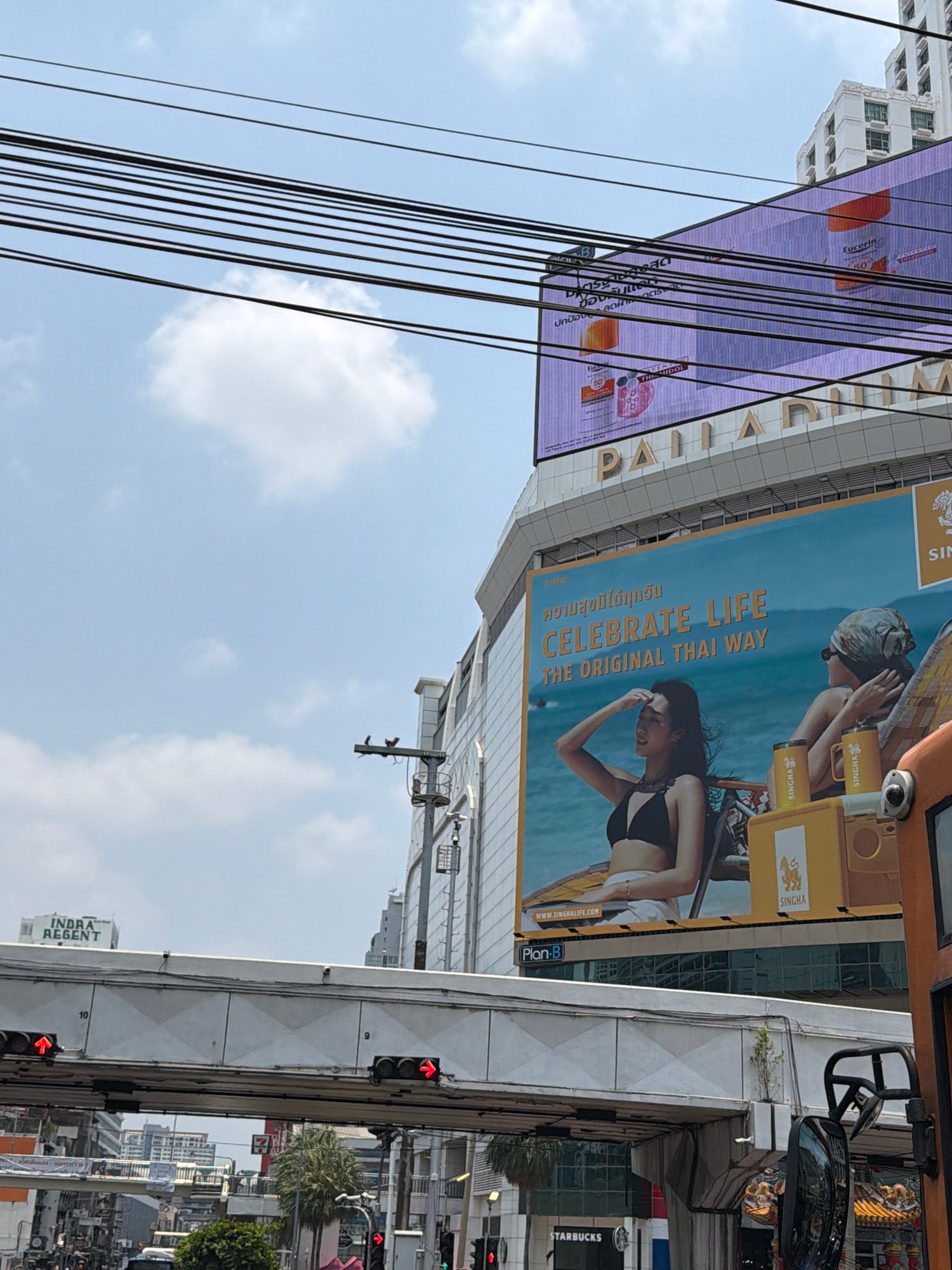 The image captures a street scene in Bangkok, Thailand. A large billboard promoting "Singha" beer is prominently displayed, featuring a woman on a boat, next to another advertisement. A digital billbo…read more