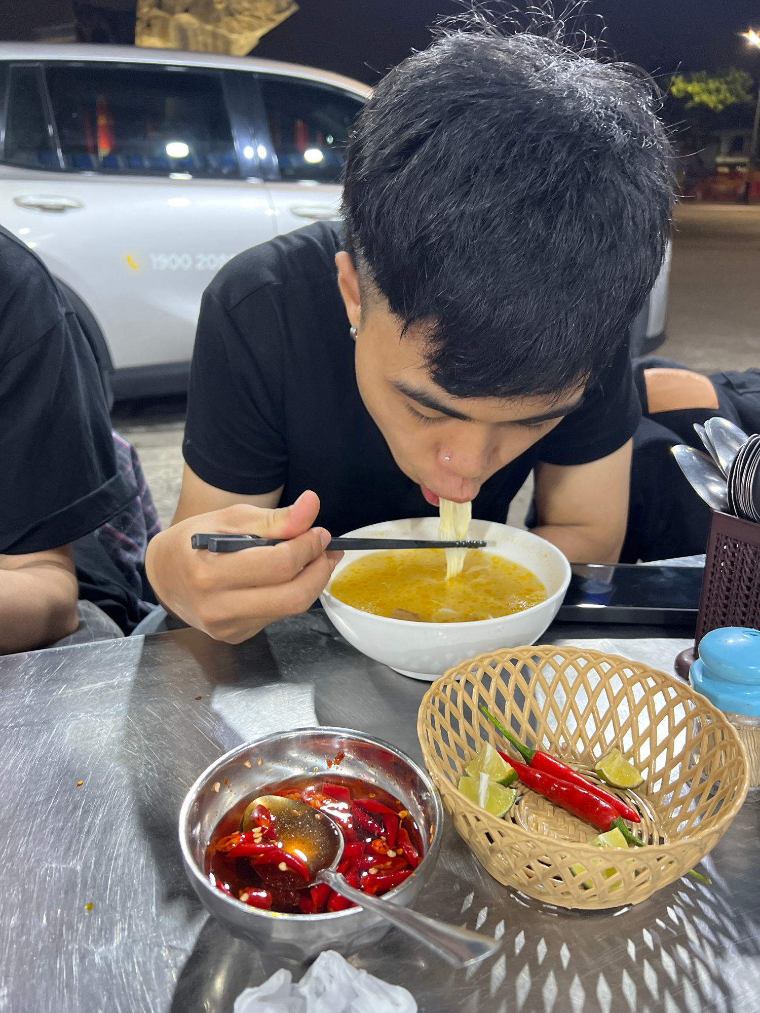 A person with black hair wearing a black t-shirt is eating noodles with chopsticks from a white bowl on a metal table. Next to the bowl is a wicker basket containing red chili peppers and lime wedges,…read more