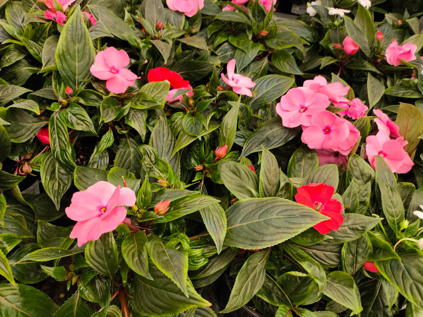 A high-angle, close-up shot shows a vibrant display of impatiens flowers in varying shades of pink and red, interspersed with dense green foliage. The flowers and leaves fill the frame, giving the imp…read more