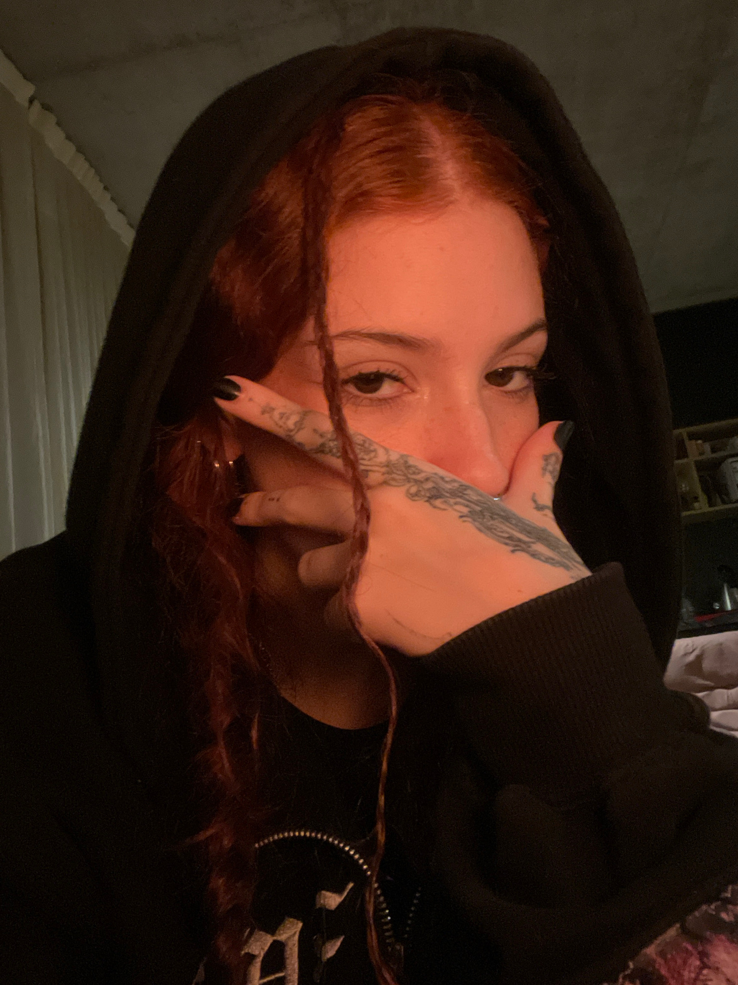 A person with red hair and fair skin is wearing a black hooded sweatshirt. The person is looking at the camera with their hand partially obscuring their face. The hand has tattoos. The person is indoo…read more