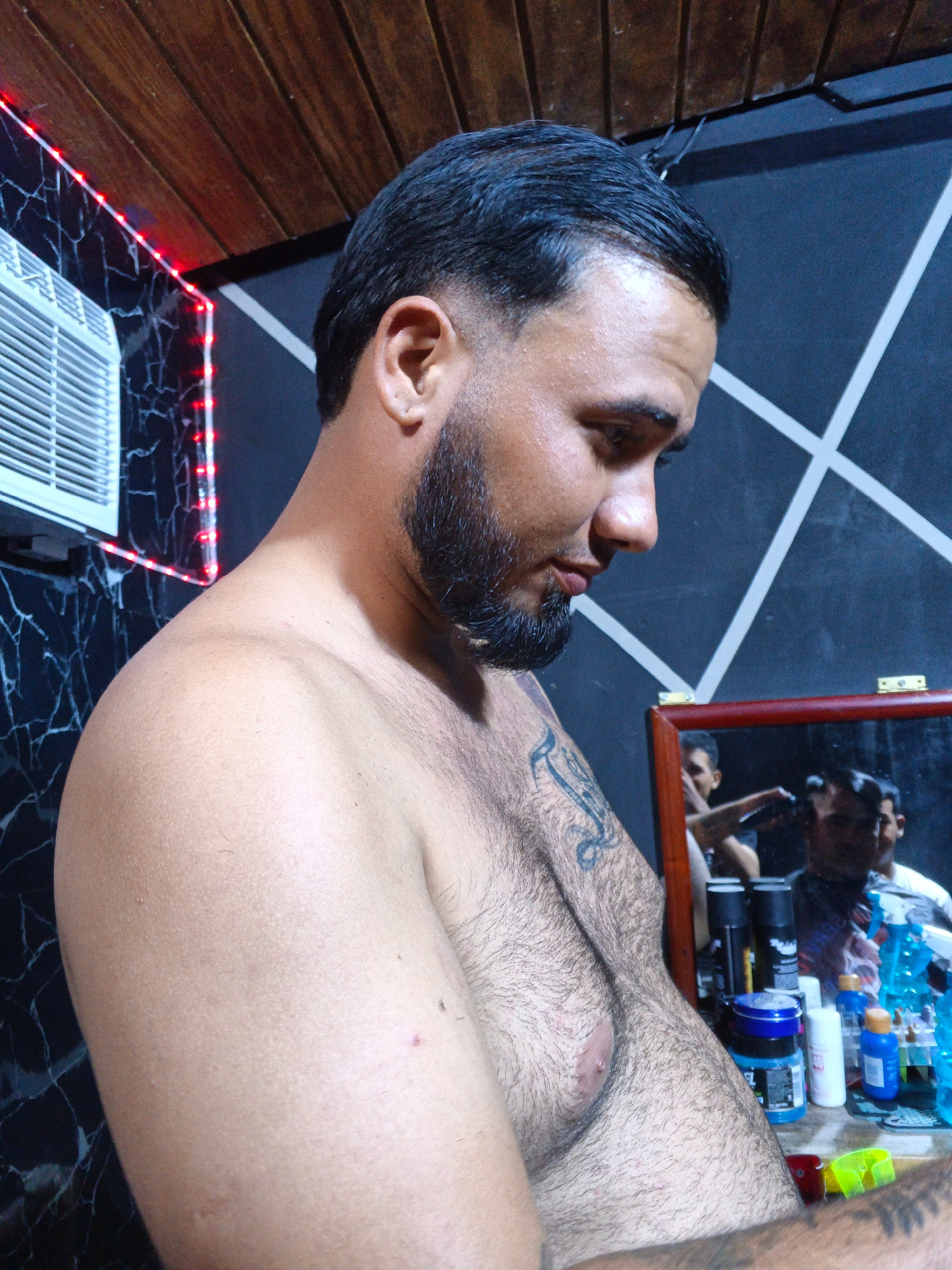 A shirtless man with dark hair and a beard stands indoors, possibly in a barber shop, as suggested by the mirror reflecting a person cutting another's hair. The man has tattoos on his left arm and che…read more