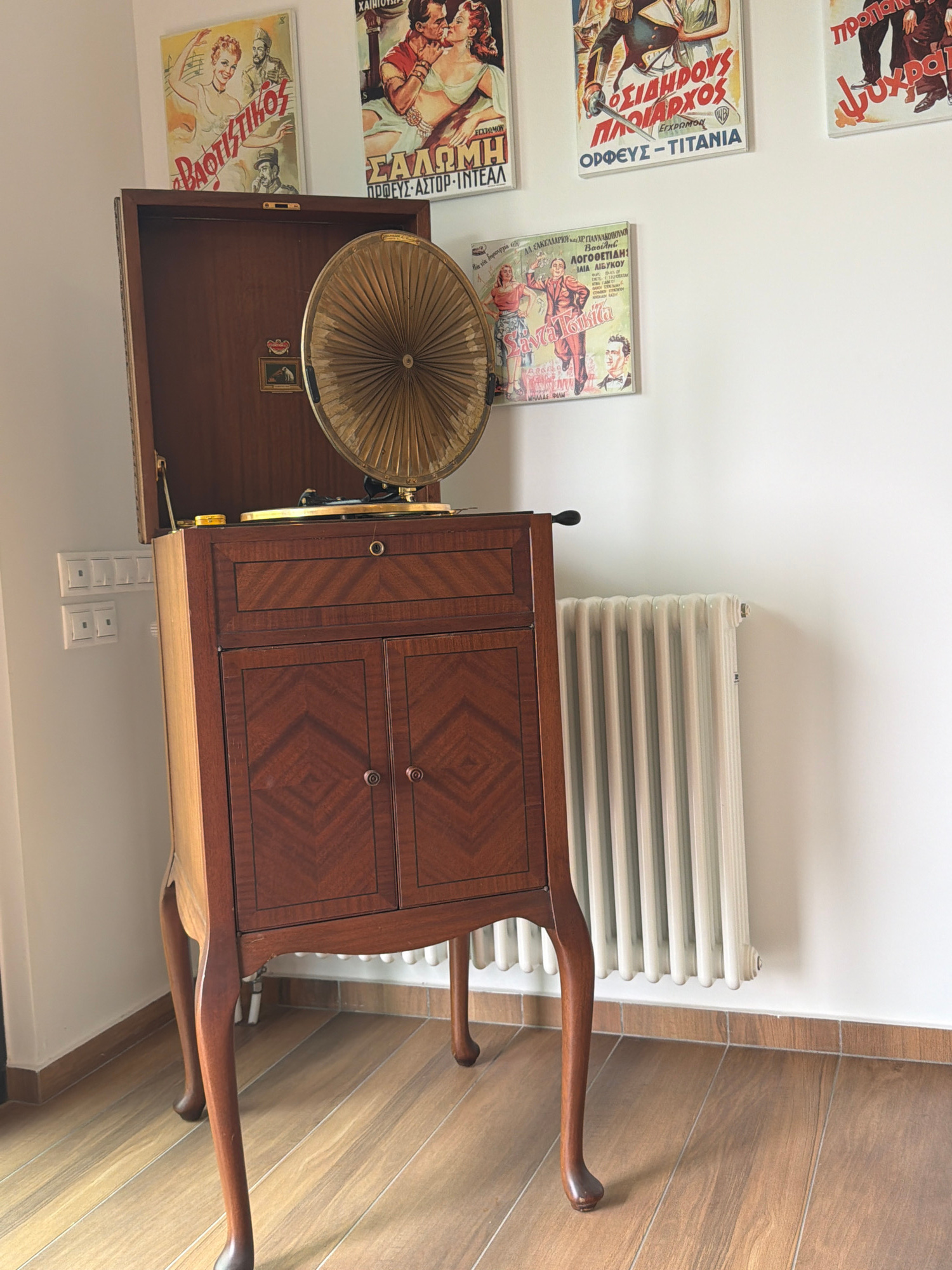The image shows an antique wooden phonograph with an open compartment revealing the turntable. The phonograph cabinet has two drawers with a patterned wood finish. The phonograph stands near a white r…read more