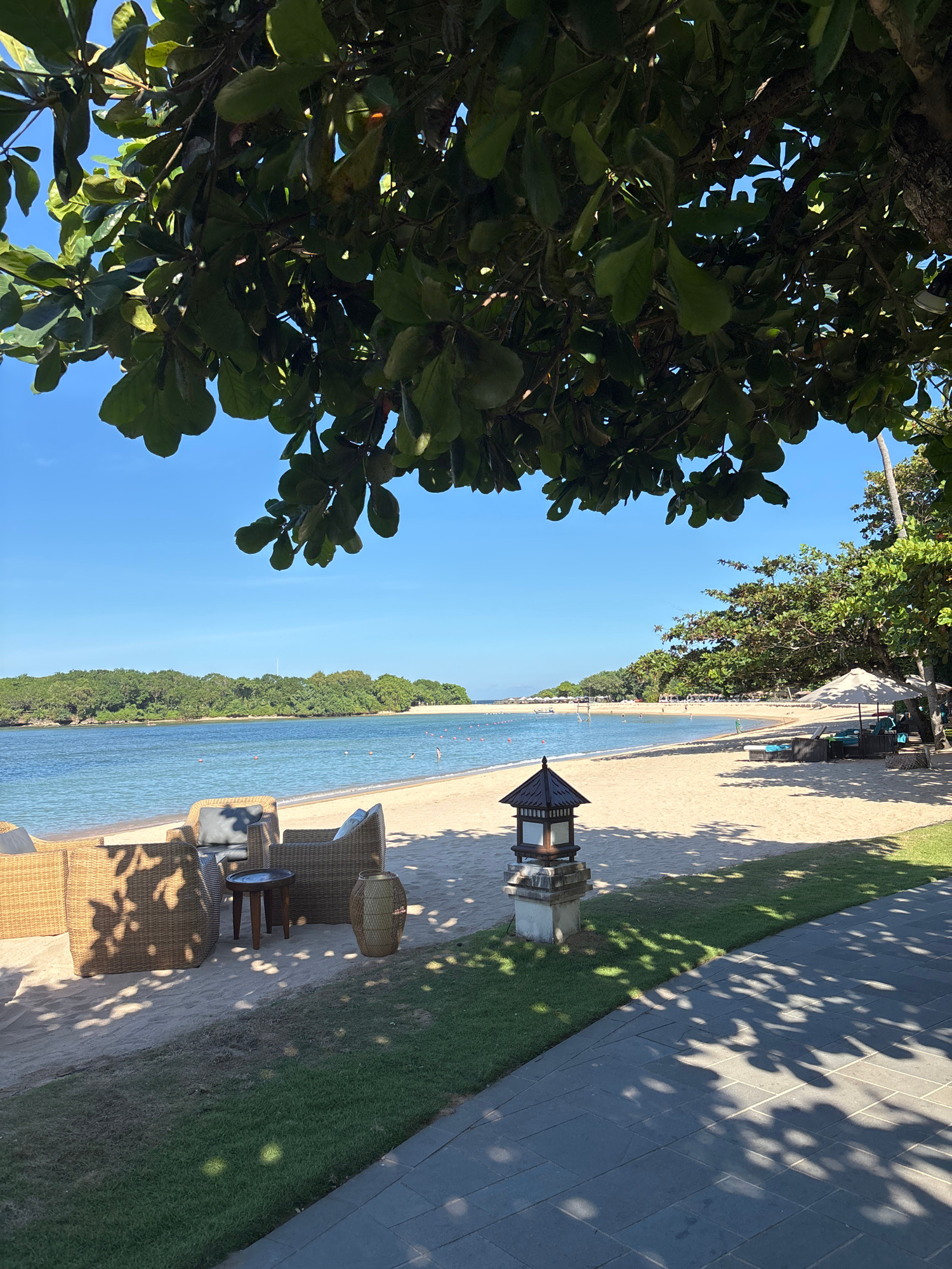 A tilted, eye-level shot shows a beach scene with trees on the left and a clear blue sky above. The beach extends from the center downwards, bordered by the ocean to the left. On the right side, there…read more