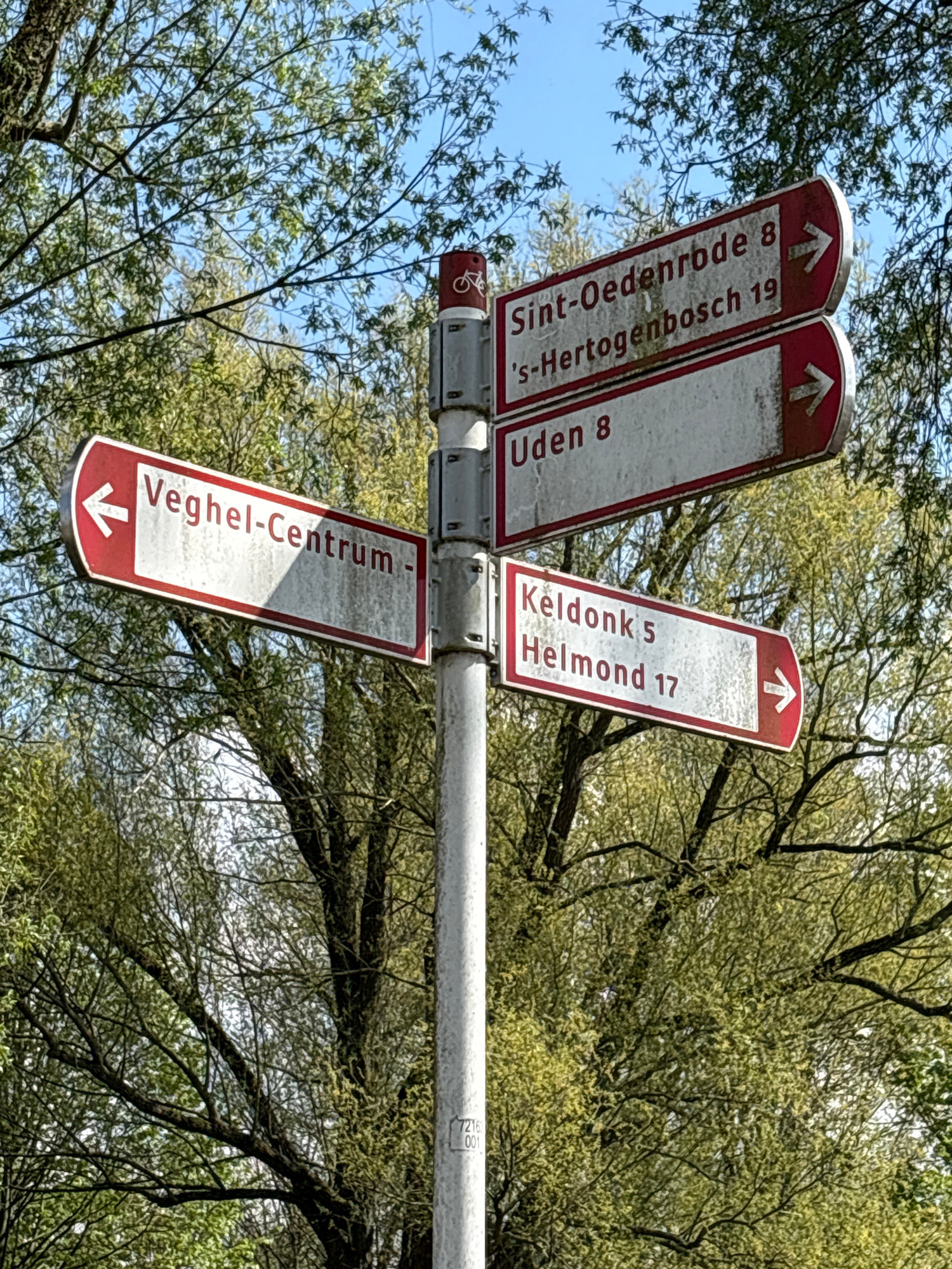 The image shows a signpost for cyclists in the Netherlands, likely located near Veghel, as one of the signs points towards "Veghel-Centrum" with a downward arrow. The other signs indicate directions t…read more